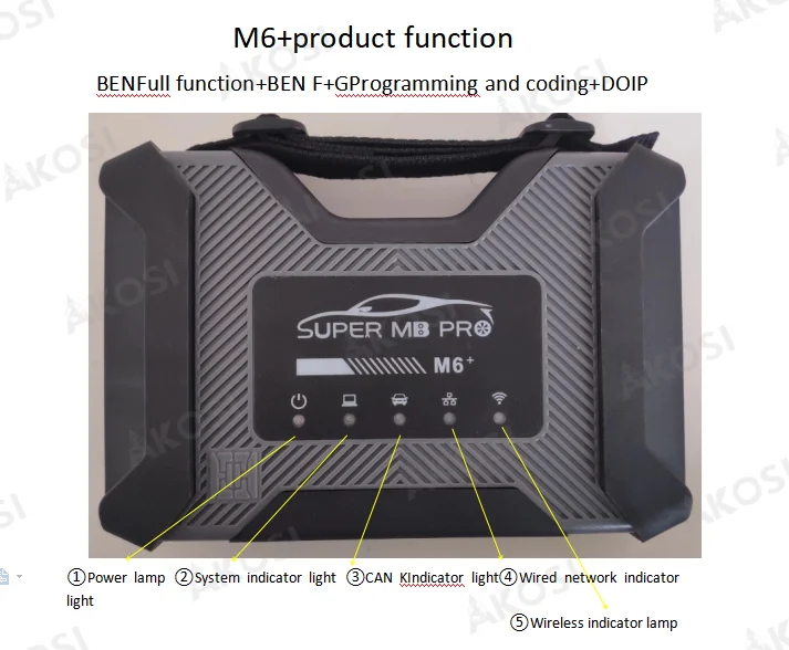 1. SUPER MB PRO M6+, with the strong penetration of wireless test and WIFI signal, relieves the dependency on communication transmission cable during test, and greatly reduces restriction on testing distance. The device, adopts the framework concept of original C6 diagnostic tool, is able to replace original MB Star C4. Durable and easy to carry.2. ABS+PVT plastic structure adoption has the advantages as follows:1) Impact-proof & easy to carry2) Lower consumption on product shell against wireless signal3) Great advancement of wireless communication distance & stability3. SUPER MB PRO M6+ adopts double-radiation mode (radiation fan & radiation fin). Radiation fan will automatically turn on high-power radiation mode when SUPER MB PRO M6 internal temperature over 35℃, greatly improving the stability and safety when programming.4. Built -in network interface prevents deformation and damage from impact.5. SUPER MB PRO M6+ is the only diagnostic tool on the market that is highly consistent with the original MB Star C6:1) Fully compatible with the original software.2) You can directly upgrade the newest firmware without installing additional driver.6. Can perform as the same functions as that of the original:Compatible with the Mercedes B-enz models with protocol DOIP, K-line, CAN Low, Can High, LIN, RS485, etc, works with the old cars and new cars.7. Support diverse M-ercedes B-enz models, covering 12v car, 24v diesel truck & bus, MPV etc.8. Support firmware update without installing the battery, but directly plug the device to the OBD port of the car to supply power, you do not need to worry about that the firmware will be damaged in the process of update.For MB Vehicles List:Car Support List: