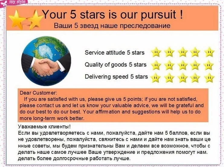 1. Гарантированный товар будет отправлен в течение 5 дней. Обычно товар будет отправлен на следующий день после оплаты.