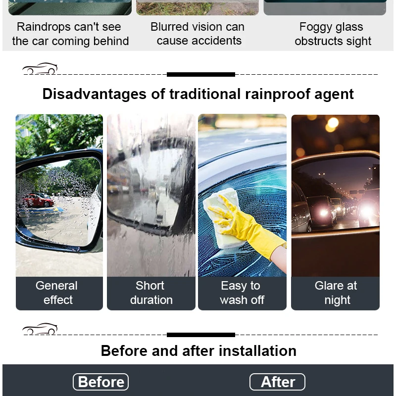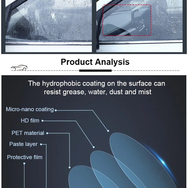 Item Type: View Mirror Waterproof FilmMaterial Type: PET+ Nano CoatingColor: HD ClearSize: 95x95mm / 135x95mm / 200x175mmFeatures:Anti-fog, anti-glare, anti-mist and rainproof,keep your rear view mirror clear at all timesUniversal designed Rearview Mirror Protective Film for Car, Suv, Truck, Trailer, etc., which fits all standard size of side mirrorsIt could clarify the view area for averting possible danger, for example, helps you to forecast the next surroundings when passing or changing lanes. It can protect your driving sight line in the rainy day.It is an innovation and it can solve your trouble that you can't see the reaview mirror clearly in the rainy day.It's waterproof and anti-fog with good effectShield and protect your Rearview Side Mirrors from unwanted scratches, smears, dust and dirt, so as to keep your rearview mirror clear all the times.High strength and high transmittancePET+Nano coating protective film with 99% transmittance, anti-fog, anti-glare, anti-mist, waterproof, rainproof, which effectively clearer your sight and better view in a rainy or foggy dayJust take a few minutes to install it to your Rearview Mirror directly, squirt a little water on the mirror, install the protective film to the mirror and adhere it, then flatten it with a small scraper, quick and easyPackage Including:2 x Mirror Waterproof Film
