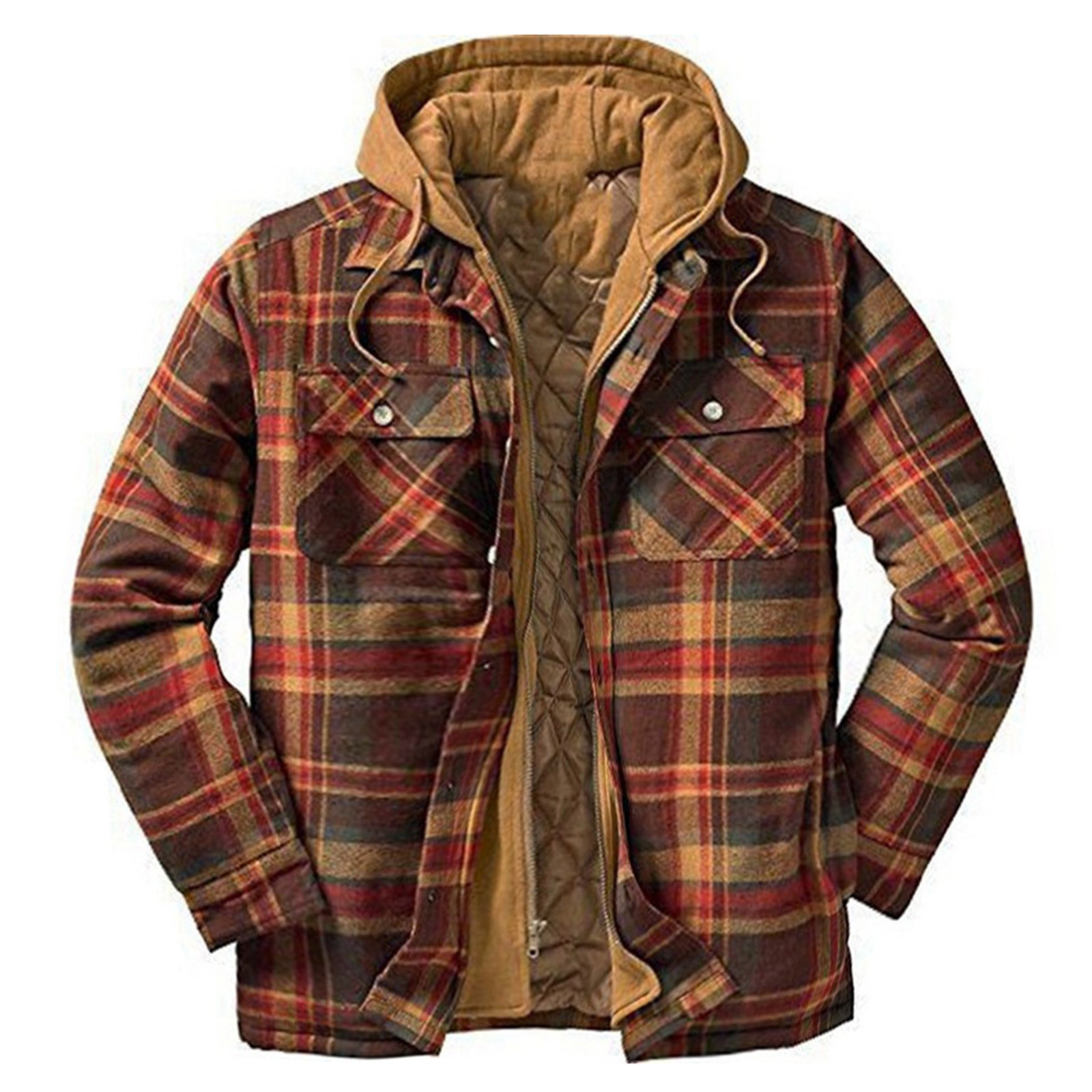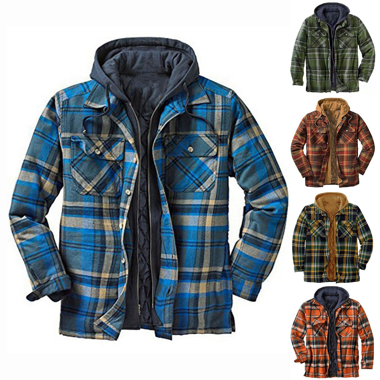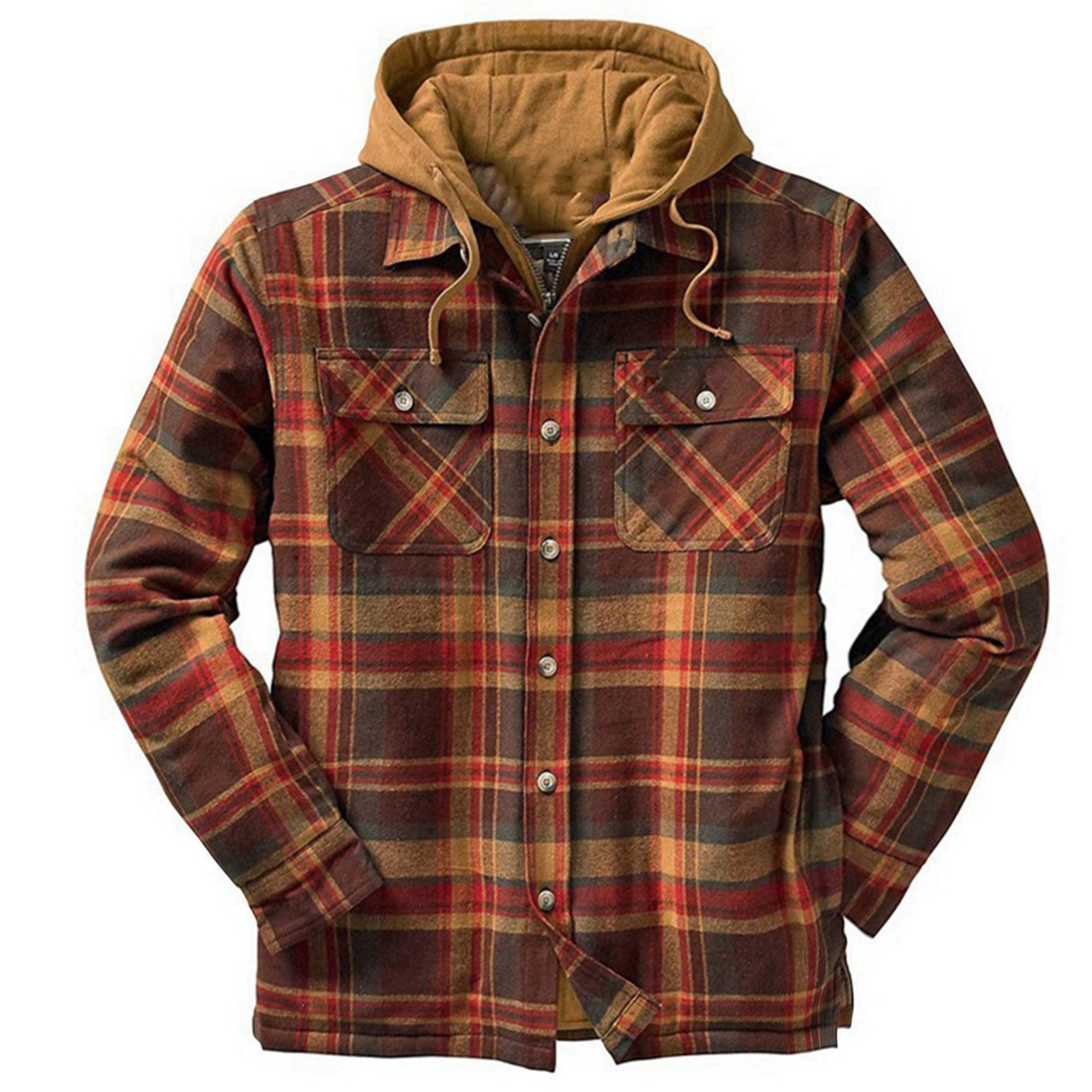 Men's Autumn And Winter Plaid Lapel Pocket Hooded Padded Loose Shirt Top Jacket