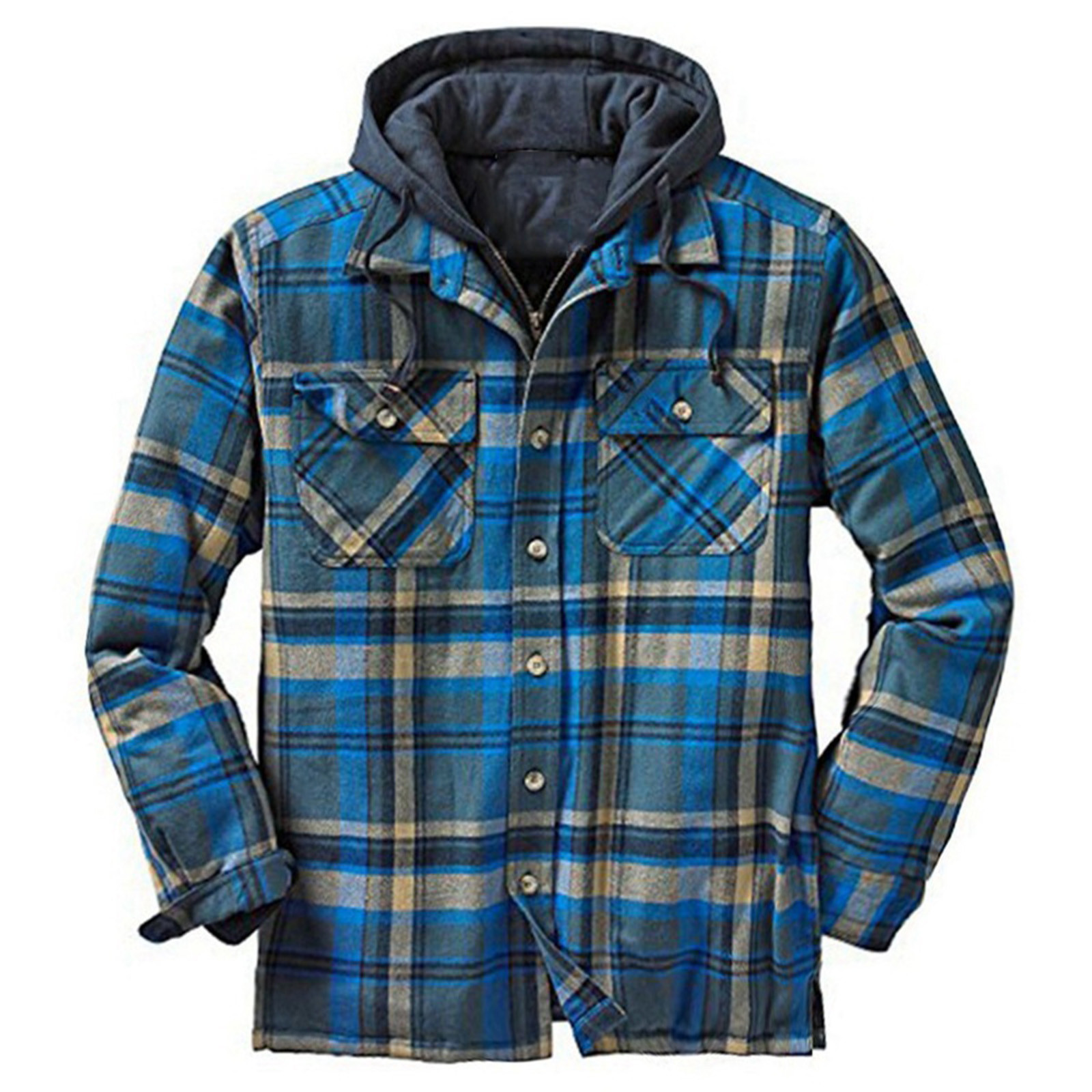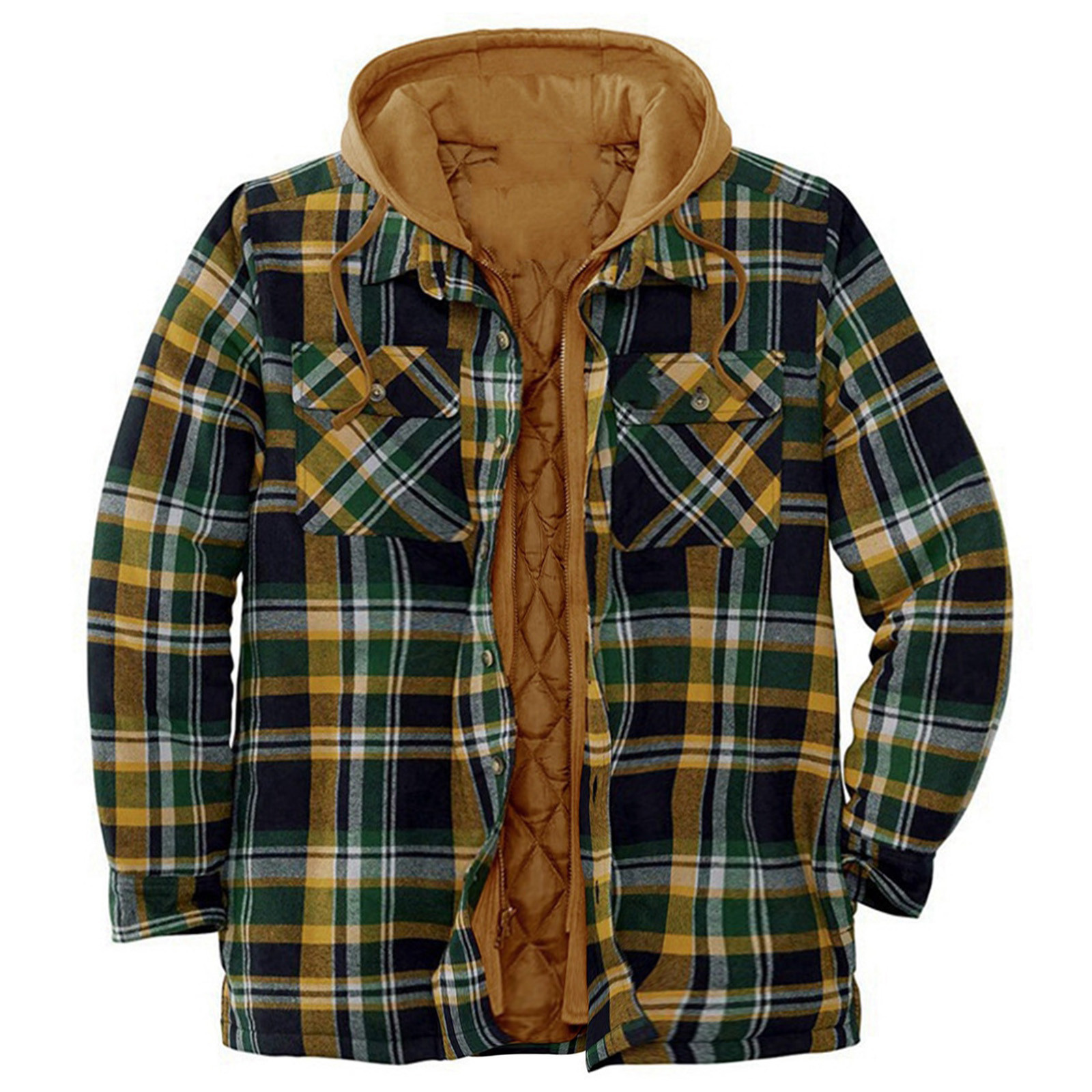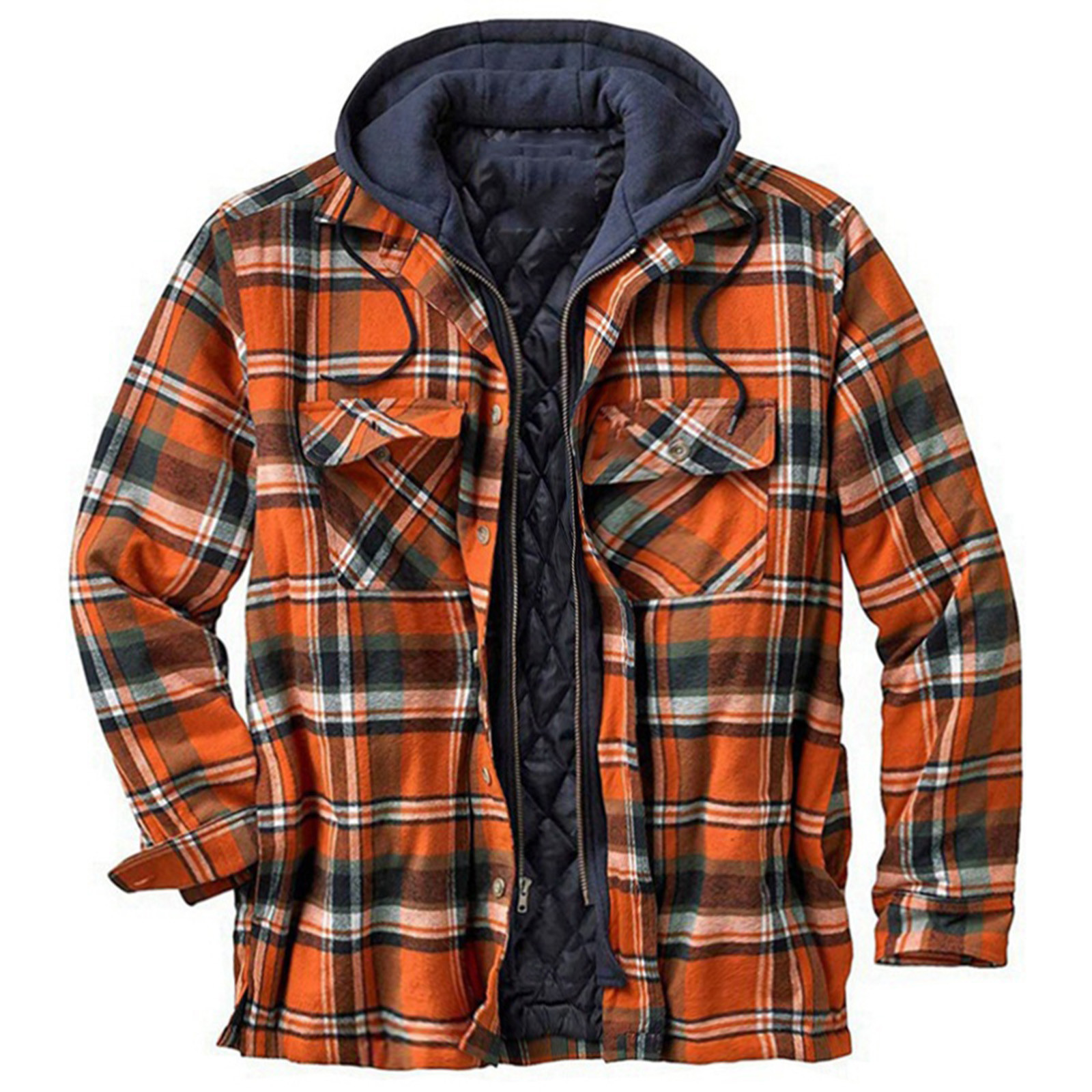 Men's Autumn And Winter Plaid Lapel Pocket Hooded Padded Loose Shirt Top Jacket