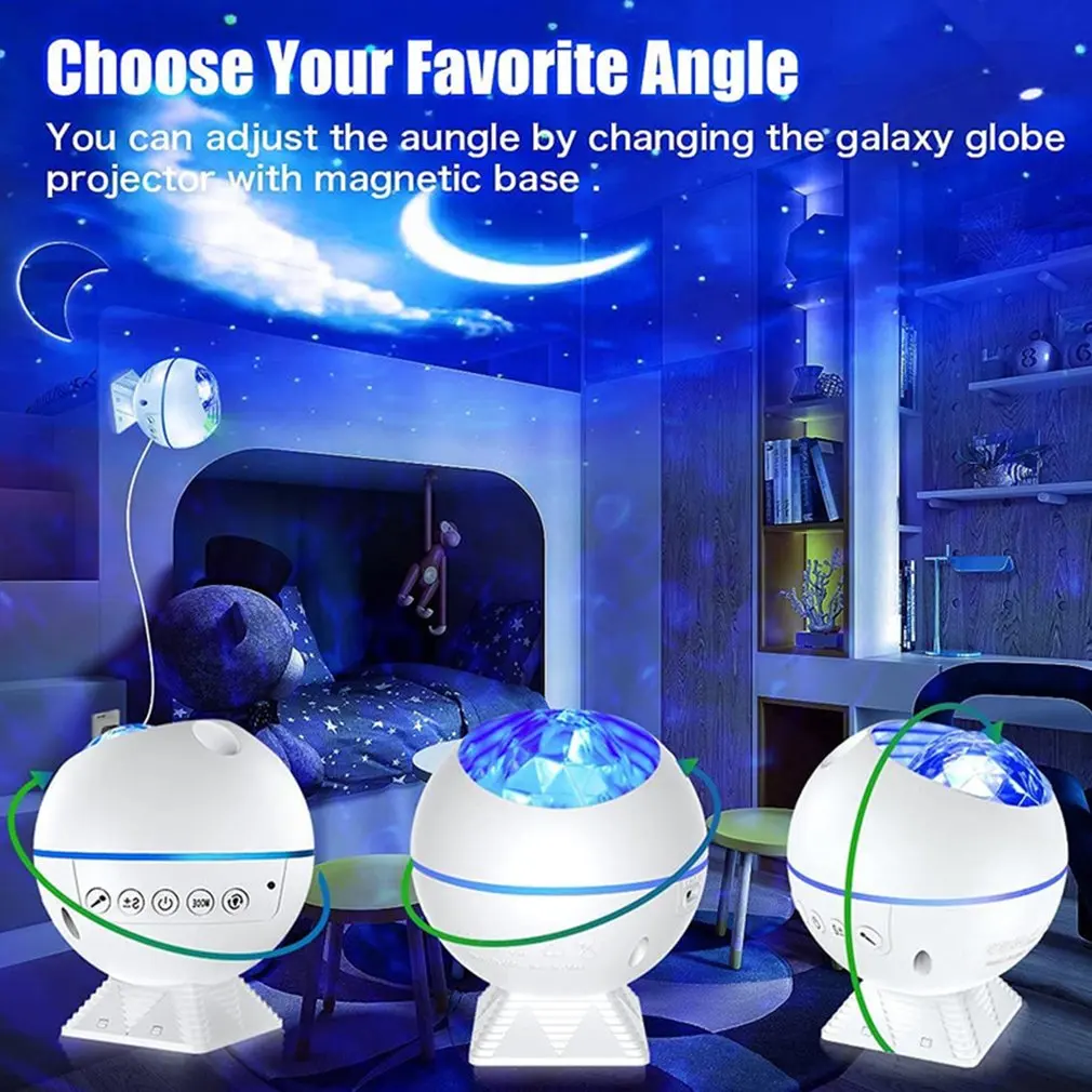 4. Мульти регулировка угла: проектор galaxy бухты Сферический. Вы можете выбрать свой любимый угол и звездный проектор Ночной светильник в разных направлениях. Проектор Galaxy очень подходит для украшения спальни и приносит каждому полный спектр визуального удовольствия.