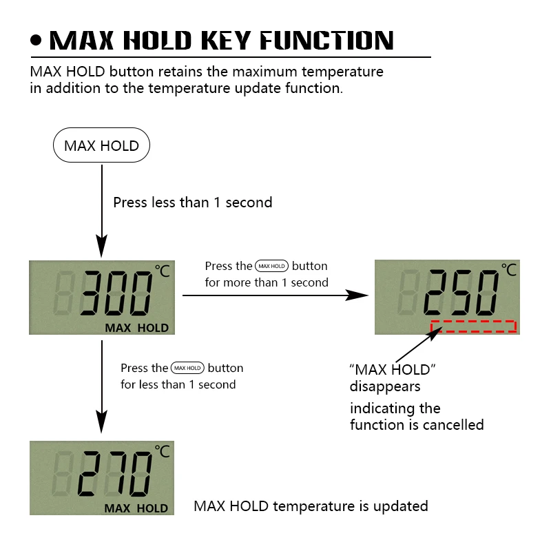 6. Функция максимального удержания: при нажатии кнопки «MAX HOLD» будет отображаться «MAX HOLD» и на дисплее будет удерживаться Максимальная температура утюга.