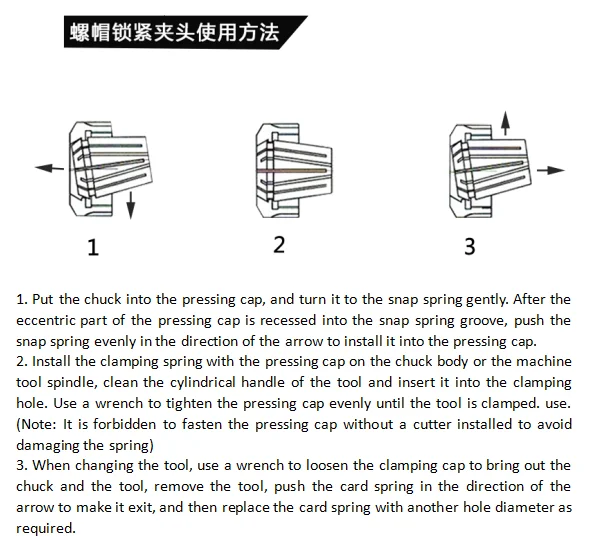 2. Установите зажимную пружину с надавливающей крышкой на корпус патрона или шпиндель станка, очистите цилиндрическую ручку инструмента и вставьте его в зажимное отверстие. Используйте гаечный ключ, чтобы равномерно затянуть прессованную крышку, пока инструмент не зажат. Использование. (Примечание: запрещается прикрепить прижимную крышку без установленного резца, чтобы избежать повреждения пружины)
