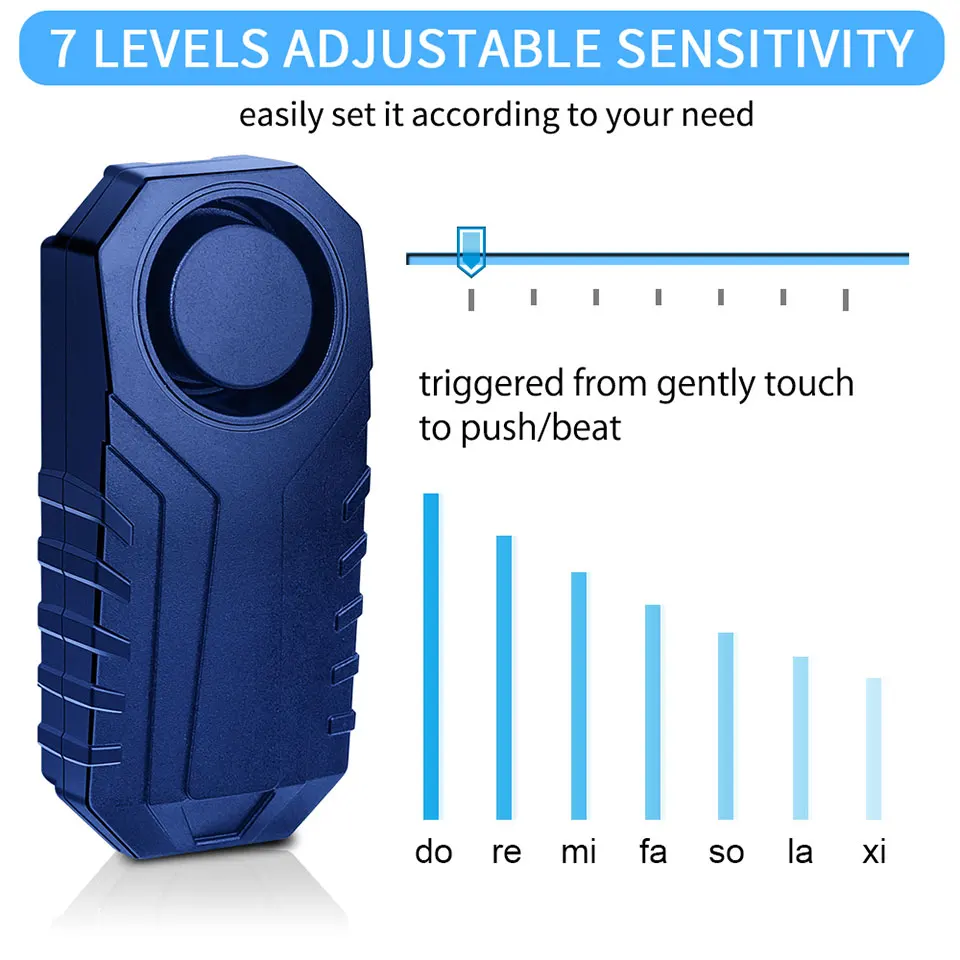 Большая громкость 113дб, Скрытая установка деталей также может эффективно удерживать Воров! Велосипеды, мотоциклы, двери и окна, вибрационная сигнализация, более точная идентификация кражи. Водонепроницаемость IP55 (Не бойтесь использовать в дождливые дни).