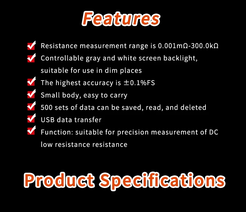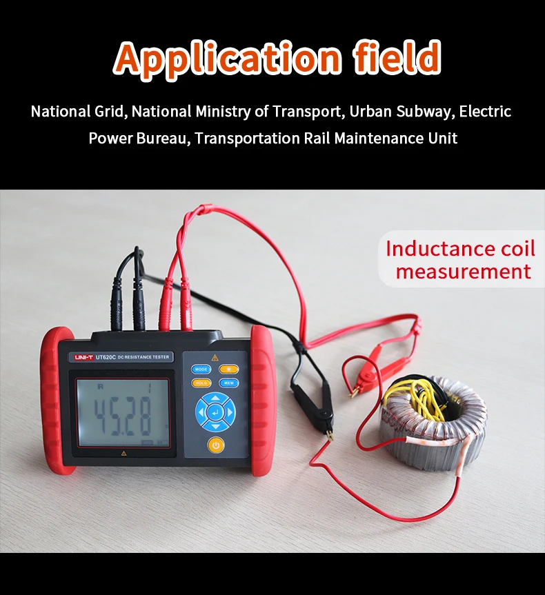 В основном используется для измерения сопротивления проводов кабелей, контактного сопротивления переключателей, соединителей, реле, сопротивления катушек, моторов, обмоток трансформатора и сопротивления заклепок металла, тест на сопротивление соединению между металлическими компонентами, тест на сопротивление низкому значению, сетку заземления и испытание на сопротивление заземляющего электрода соединительного проводника, Тест на сопротивление контакта и т. Д.