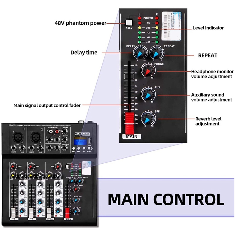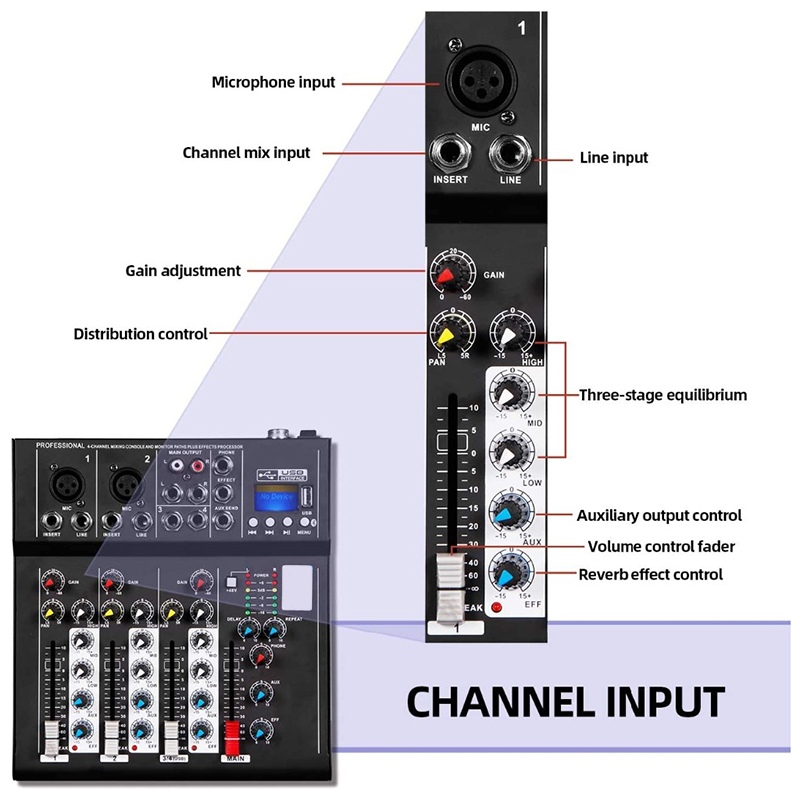 Практичный и эстетичный: 4-канальный аудио вход переменного тока, профессиональный 3-ступенчатый сбалансированной регулировкой, встроенный реверберации эффект, демпфирования с тонкой оправой, более профессиональная подгонка, лучшее качество звука.