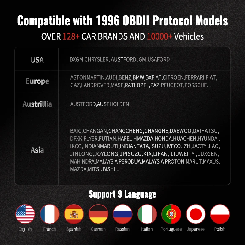 Поддержка 126 + автомобильных брендов и 1000 + транспортных средств