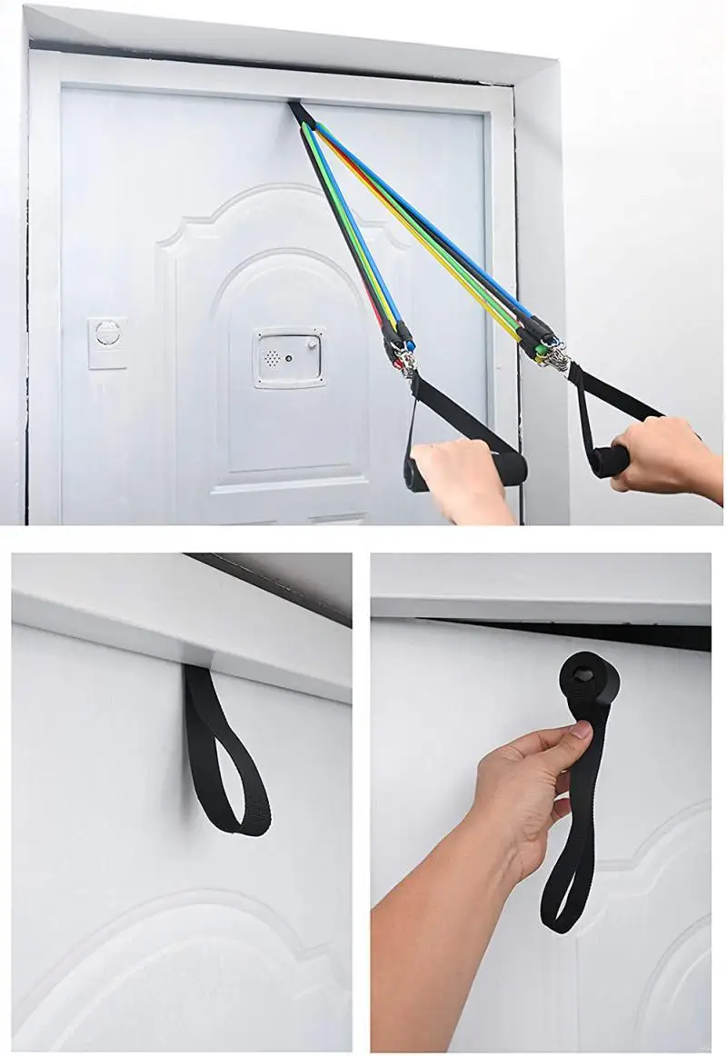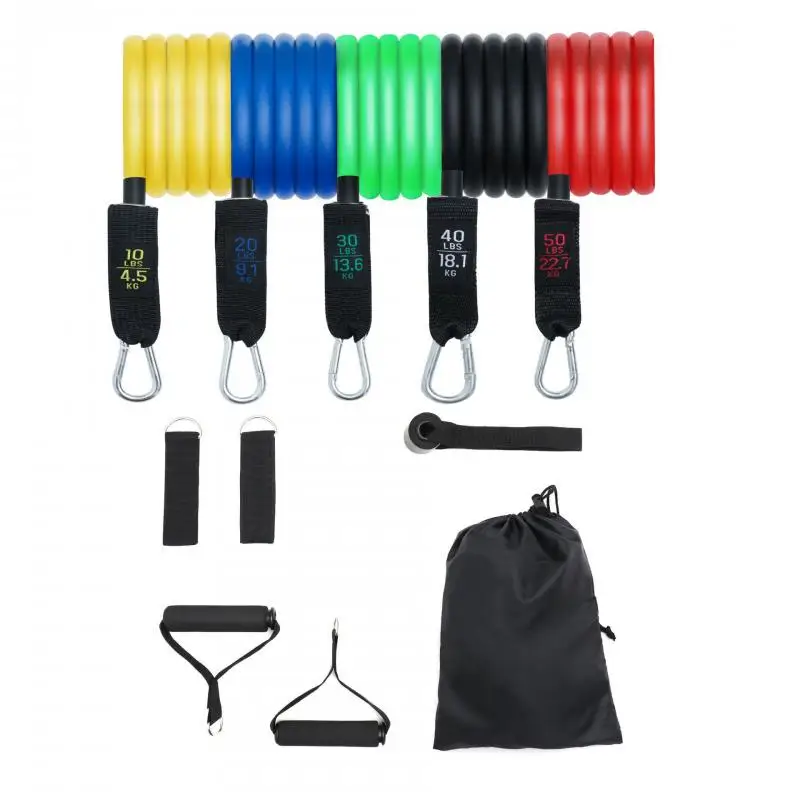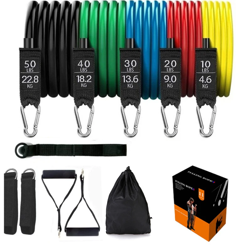 11 Наборы веревок для фитнеса: в том числе 5 резинок, 2 ручки, 1 дверной анкер, 2 лодыжки и 1 сумочка.