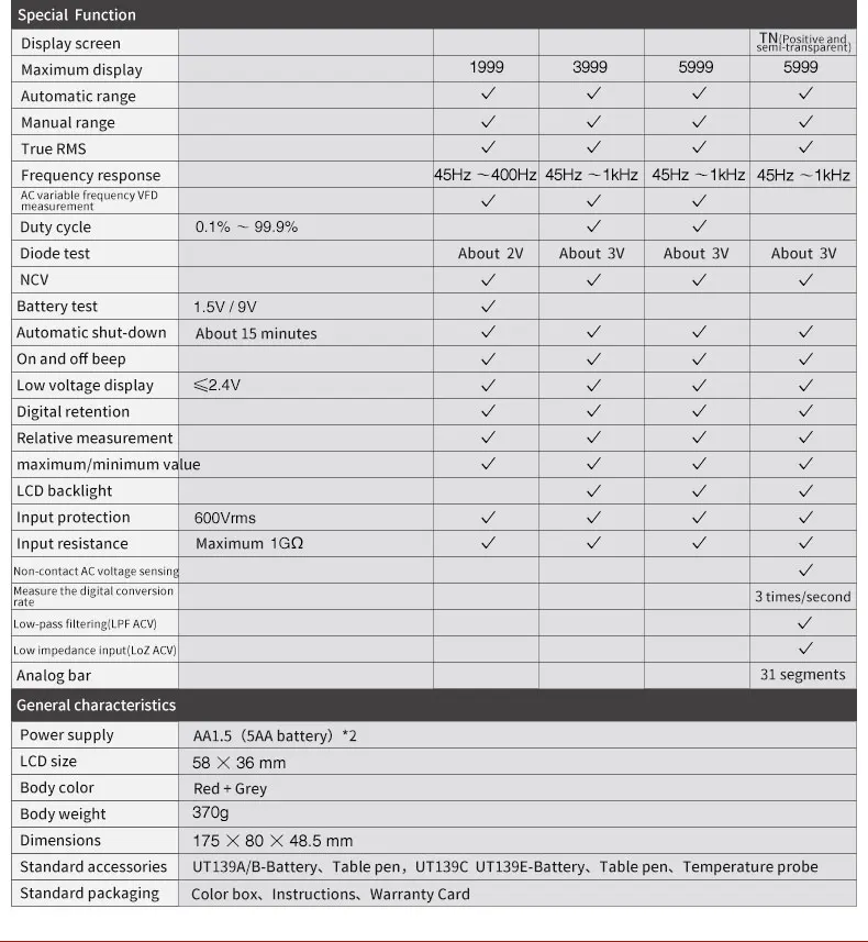 Серия UT139-Цифровые мультиметры CAT III 600V, предназначенные для электриков. Его функция NCV может эффективно проверять электрическое состояние путем измерения интенсивности поля EM. Новые модели UT139E/S включают специальные функции, такие как LoZ (ACV) для измерения напряжения ghost'. Его встроенный 31 в поп упаковке, аналоговая панель также дает электрики лучшее визуальное отображение результатов измерений. UT139S построен с черным дисплеем EBTN и является идеальным счетчиком для работы в темных условиях.