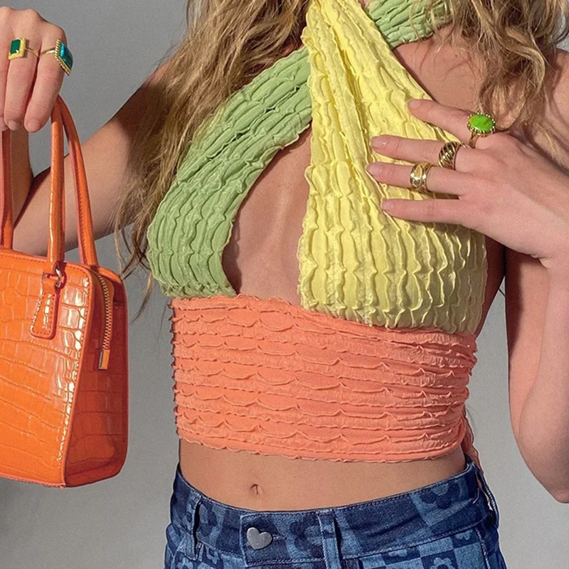 Холтер шеи дисплей грудь жилет хит цвет сексуальный безпоясный маленький v-образный вырез слинг Стиль Тонкий жилет многоцветный