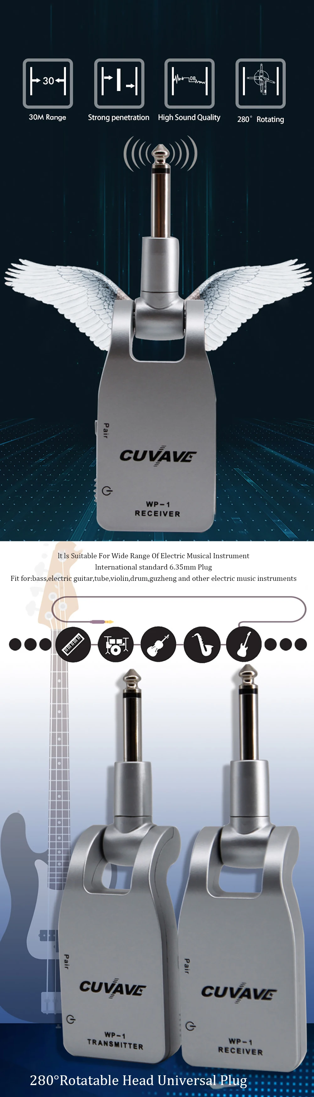 -Применяется беспроводная технология UHF с сильной защитой от интерфейса и стабильной передачей сигнала, без задержек или потери сигнала; Поддерживает чистые и металлические эффекты, позволяя вам создавать различные стили гитарного звука.