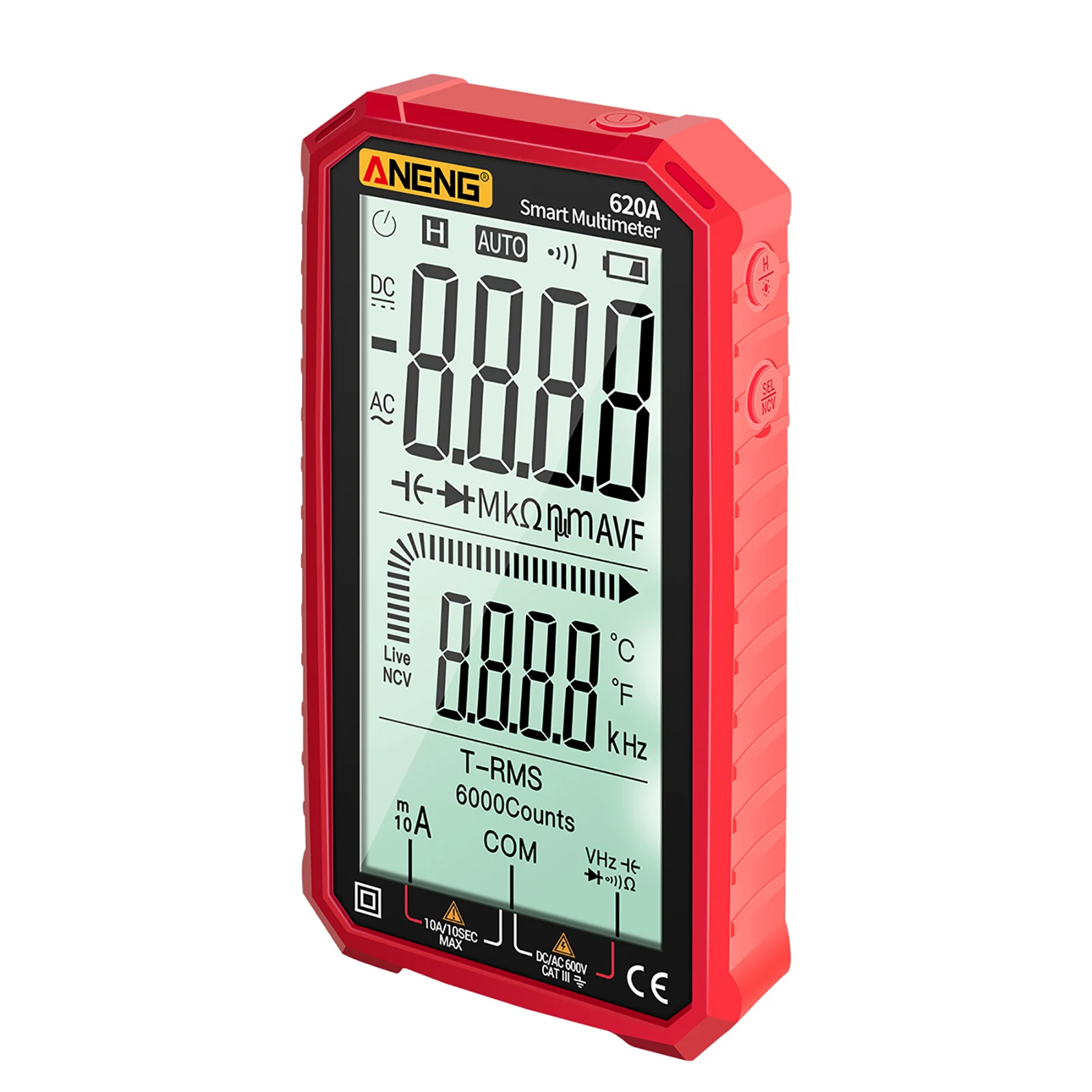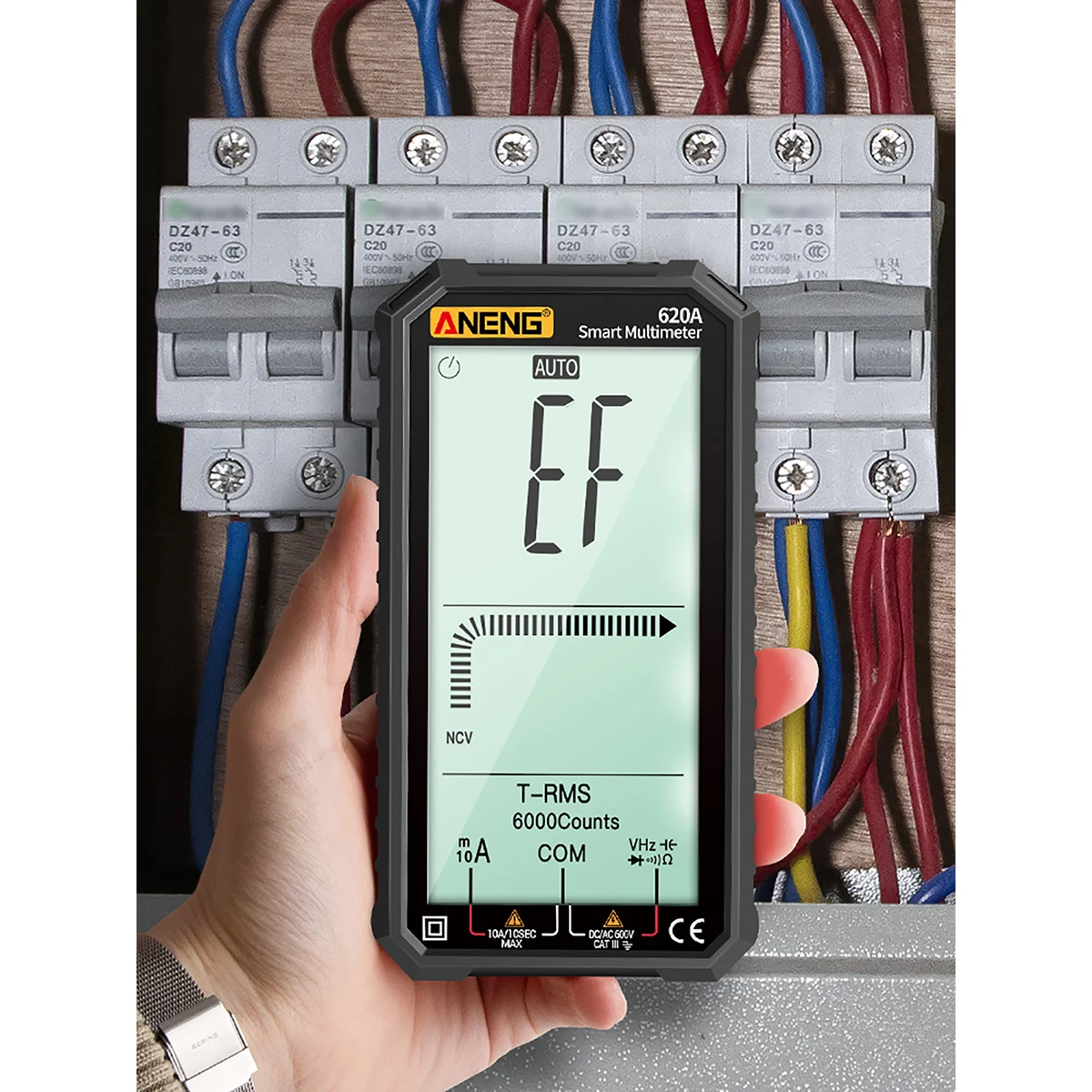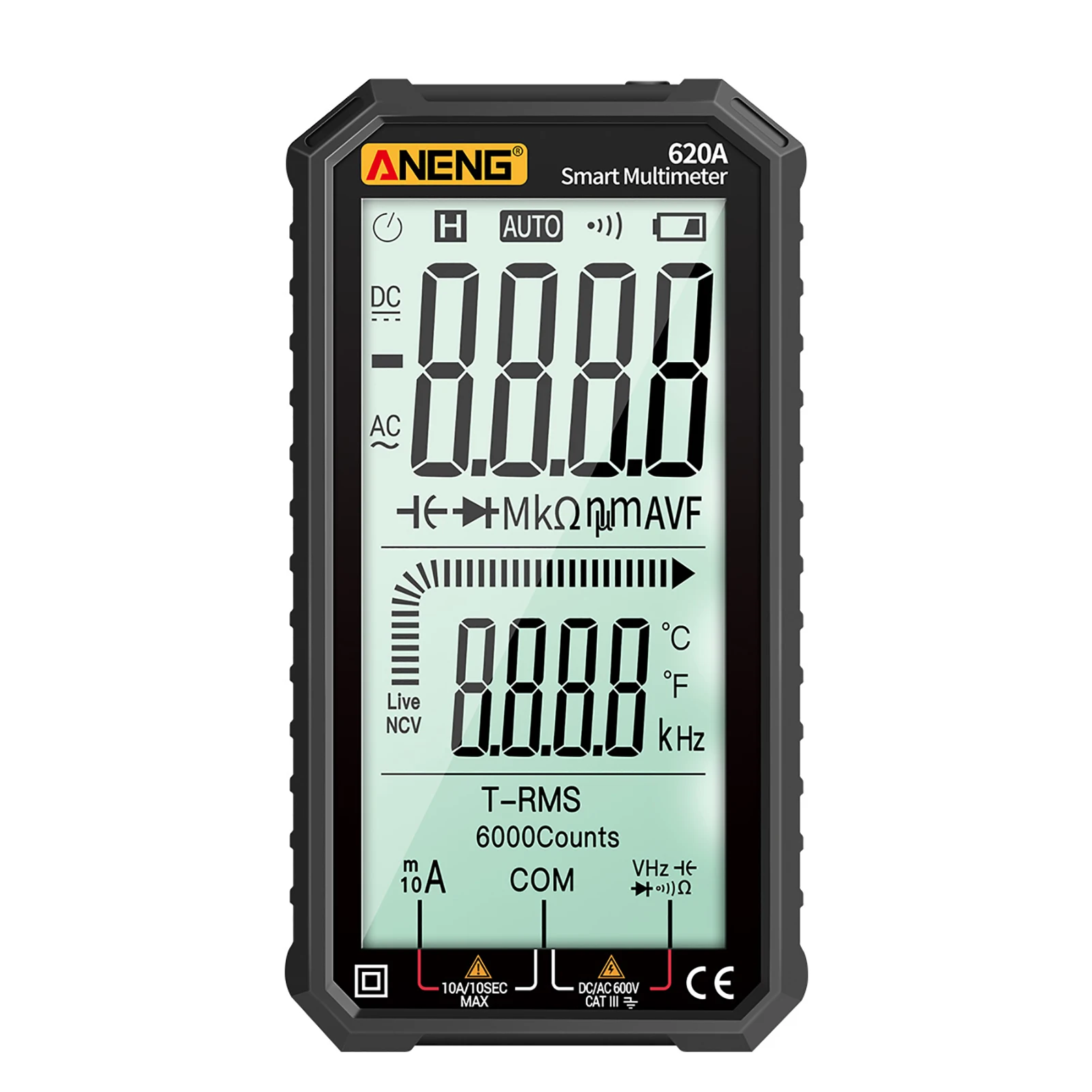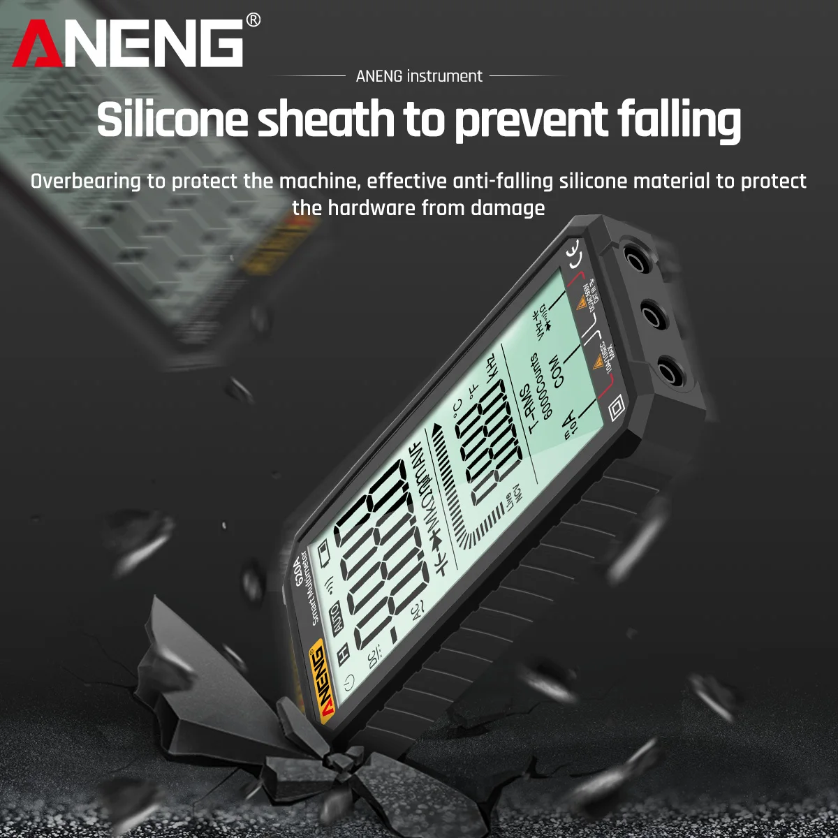 Карманный мультиметр ANENG отличается размером ладони, большим ЖК-дисплеем 4,77 дюйма, автоматическим диапазоном, истинным RMS, защитой от перегрузки, противоударным силиконовым покрытием и звуковым сигналом NCV. Он является ультрапортативным для обслуживания автомобилей, электроники, бытовой техники, ОВКВ и многого другого.