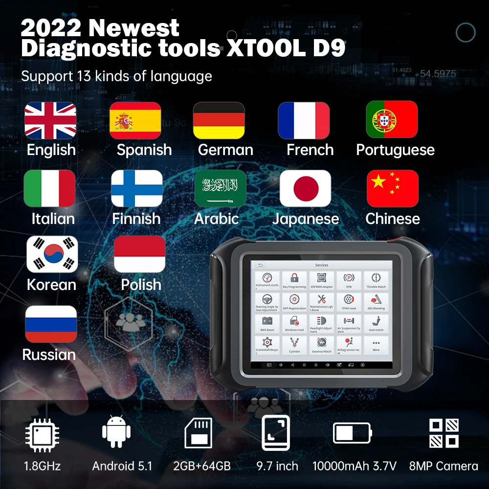 XTOOL D9 автомобильный диагностический сканер может работать на более чем 85 + американских отечественных, европейских и азиатских марок и моделей, более 10000 автомобилей, широкое покрытие транспортного средства может предоставить вам почти каждый диагностический вариант, который может понадобиться механику. С помощью многоязычного меню вы можете легко переключаться между языками, позволяя механикам избегать языковых преград и фокусироваться на данных об автомобиле.