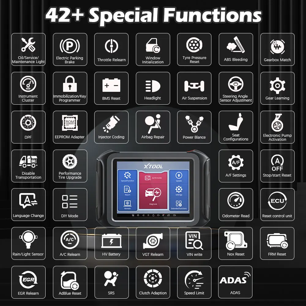 XTOOL D9 с инструментом обслуживания автомобиля предназначен для механики и мастерской, гаражей. Наряду со стандартными сервисными функциями, такими как сброс масла, настройка EPB, SAS, регенерация DPF, переобучение дроссельной заслонки и Кодирование инжектора, IMMO, кровотечение ABS, сброс TPMS, сброс BMS и т. д. Примечание: Сервисные функции не работают на всех транспортных средствах.