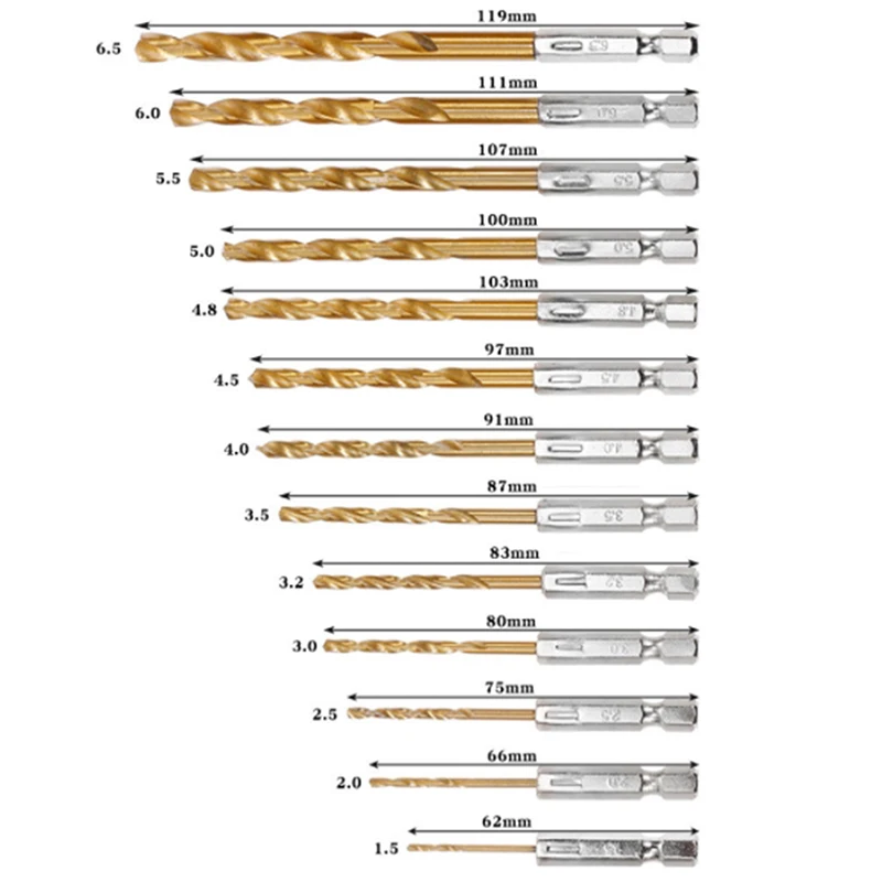 1. Этот набор прочных 13 шт. титановое нитридное покрытие сверла длится в шесть раз дольше, чем стандартные сверла. Шестигранный хвостовик 1/4 "разработан специально для беспроводных отверток, что позволяет быстро менять сверла.
