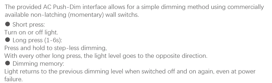 ● Интерфейс затемнения: RF Wireless, AC Push-Dim