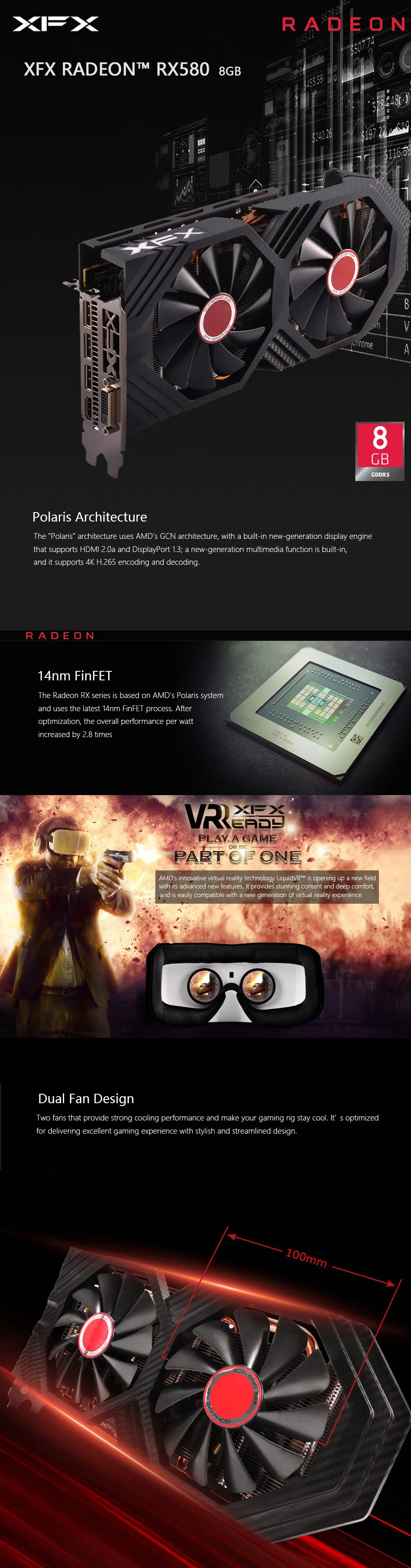 RADEON™Видеокарты серии RX используют архитектуру «Polaris» и архитектуру AMD GCN, встроенные в дисплейный двигатель нового поколения, поддержка HDMI 2.0a и порт дисплея 1,3; встроенный в новое поколение мультимедийных функций, поддержка кодирования и декодирования 4K H.265. Используйте 14 нм процесс FinFET. После оптимизации, общая производительность на ватт потребляемой мощности увеличивается на 2,8 раз.
