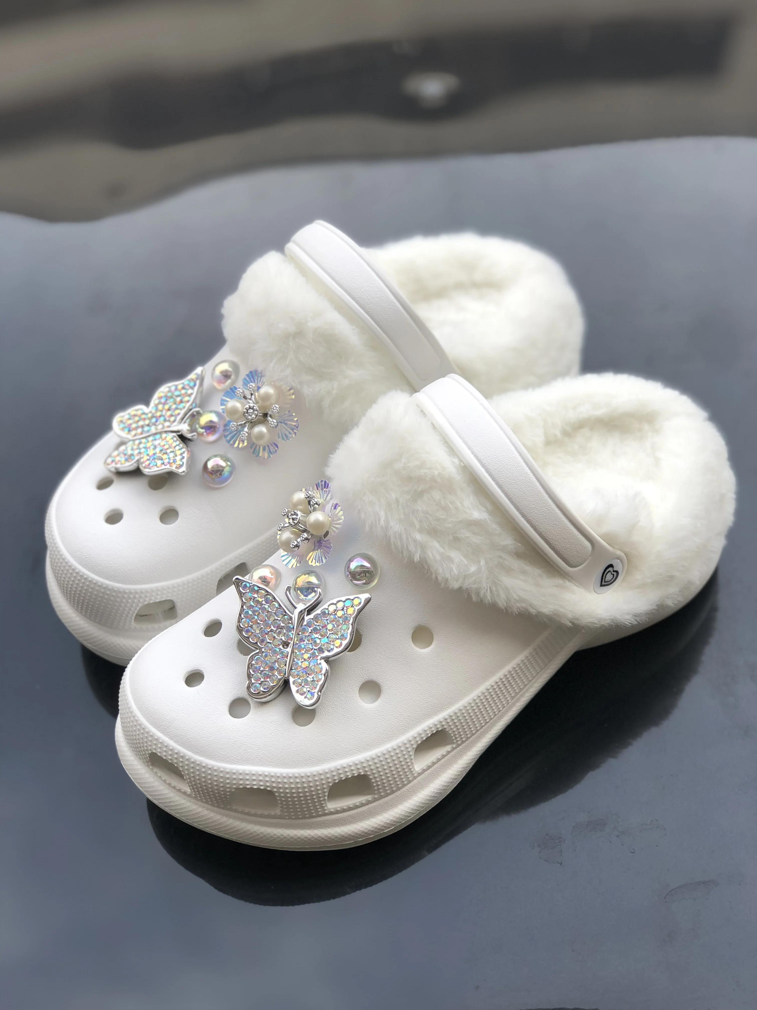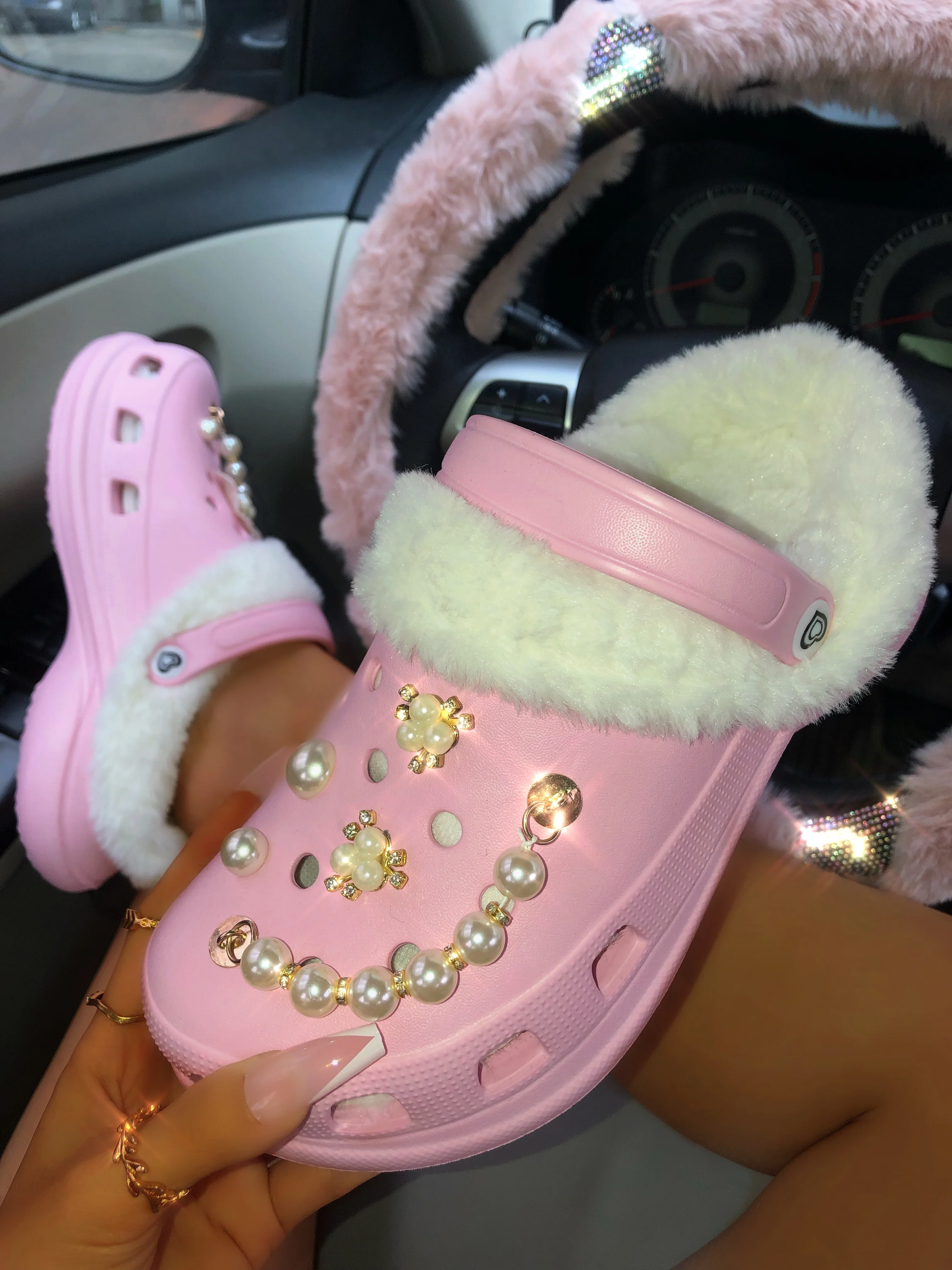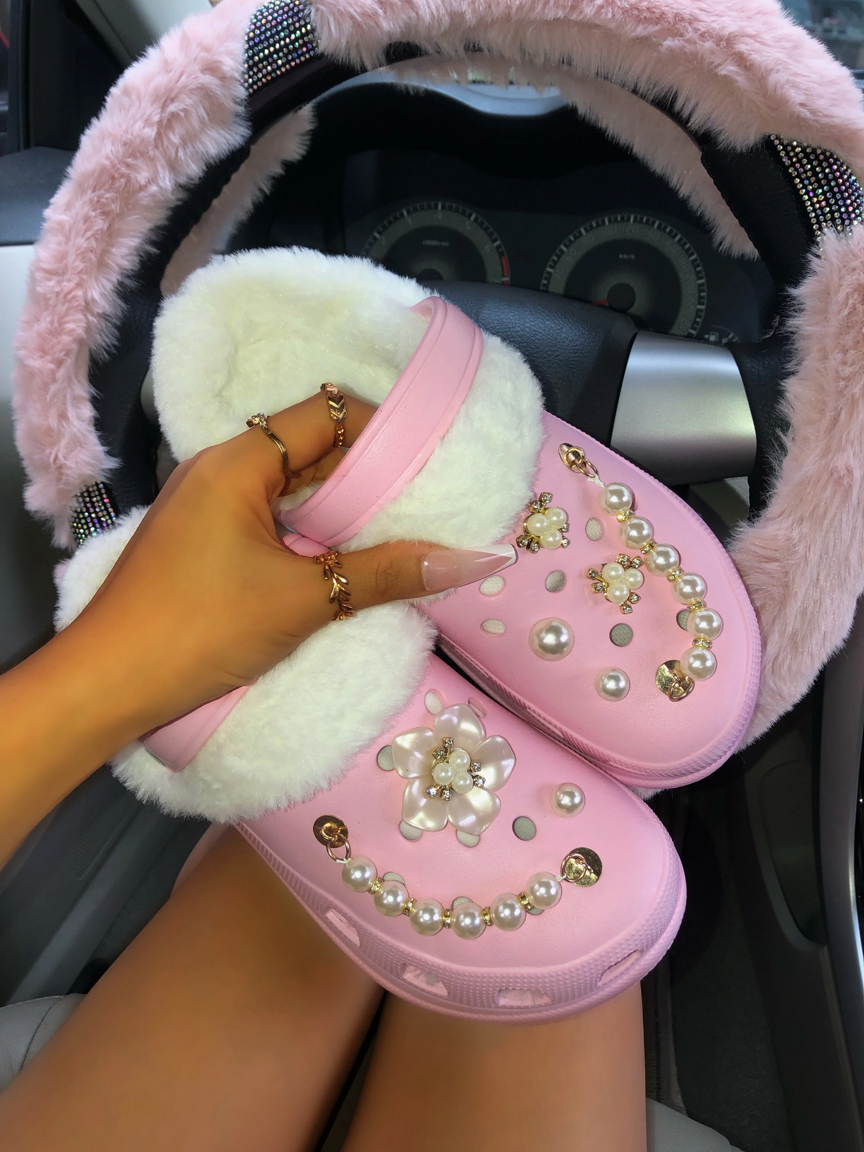 Новое поступление; Женские плюшевые сабо на высоком каблуке; Меховая обувь с отверстиями; Босоножки на толстой подошве; Тапочки с жемчужной цепочкой; Зимние теплые милые меховые шлепанцы для девочек