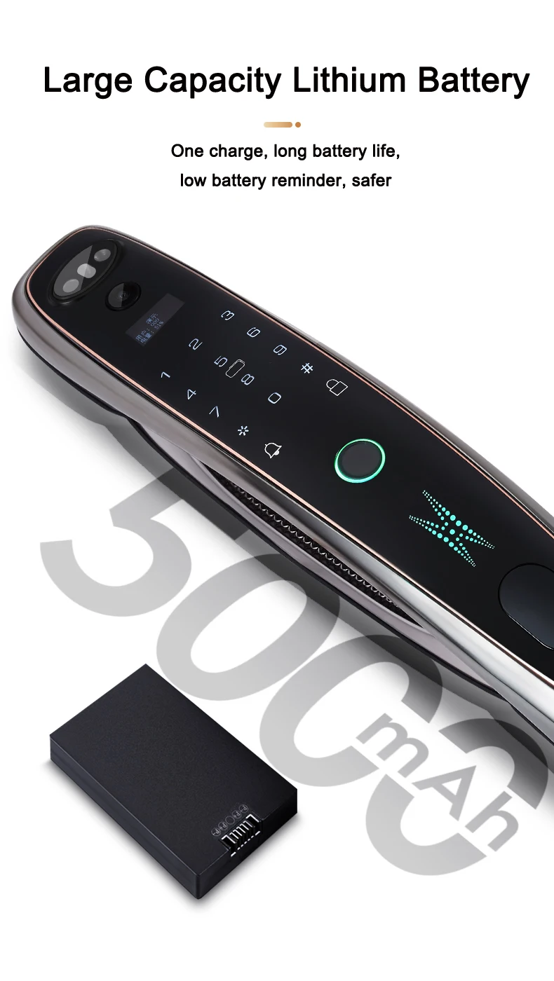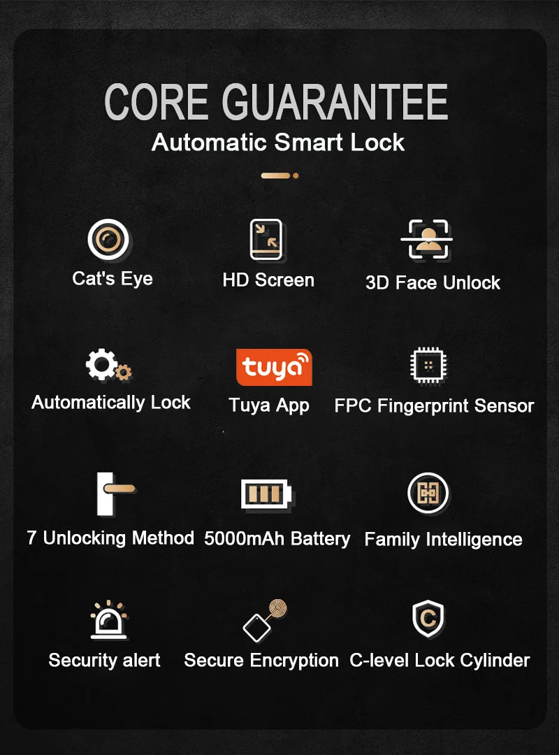 Функция: Удаленное разблокирование фотографий Tuya, временный пароль, напоминание о переключении, запись использования, распознавание лиц, отпечаток пальца, магнитная карта, пароль, ключ, автоматический замок переключателя, дверной звонок, сигнализация против взлома