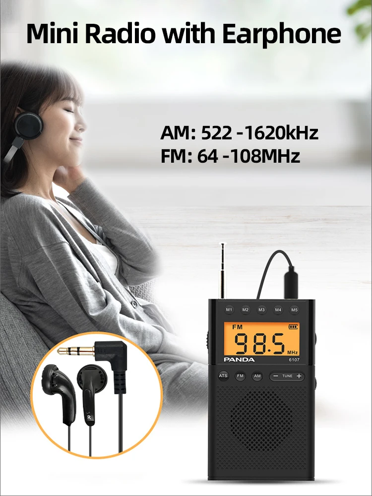 Панда 6107 портативное карманное радио FM AM с гарнитурой-лучший прием, звук чистый динамик, ЖК-дисплей, ATS поиск, радио коллекции