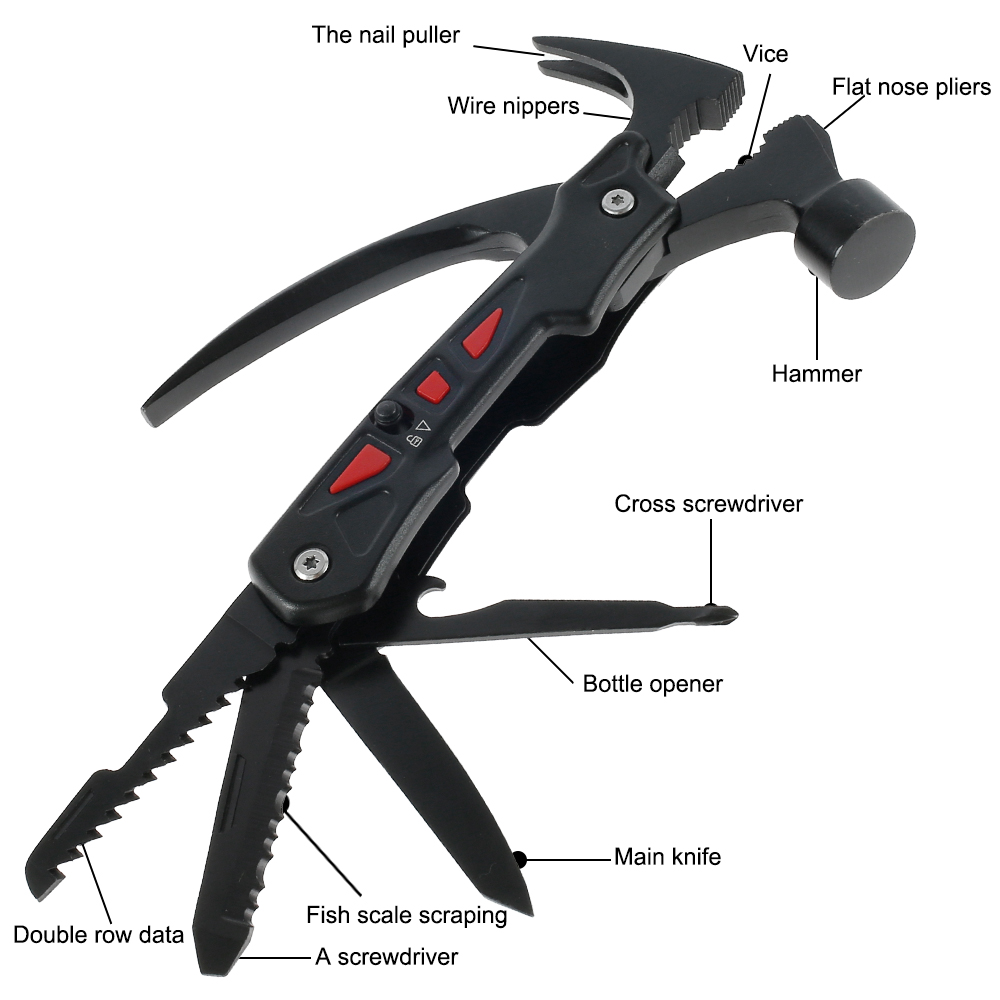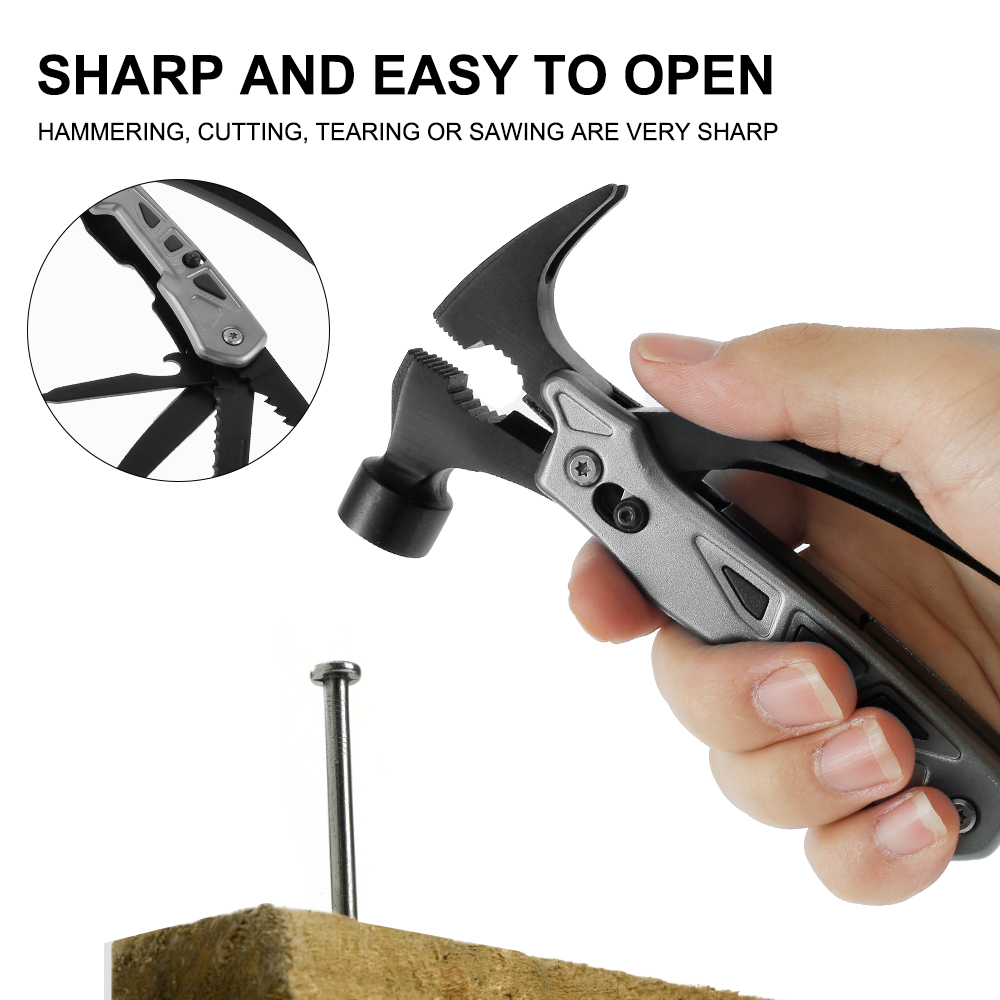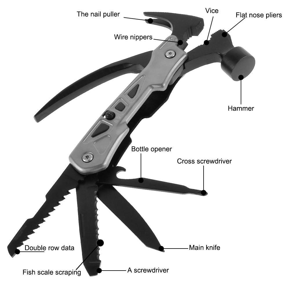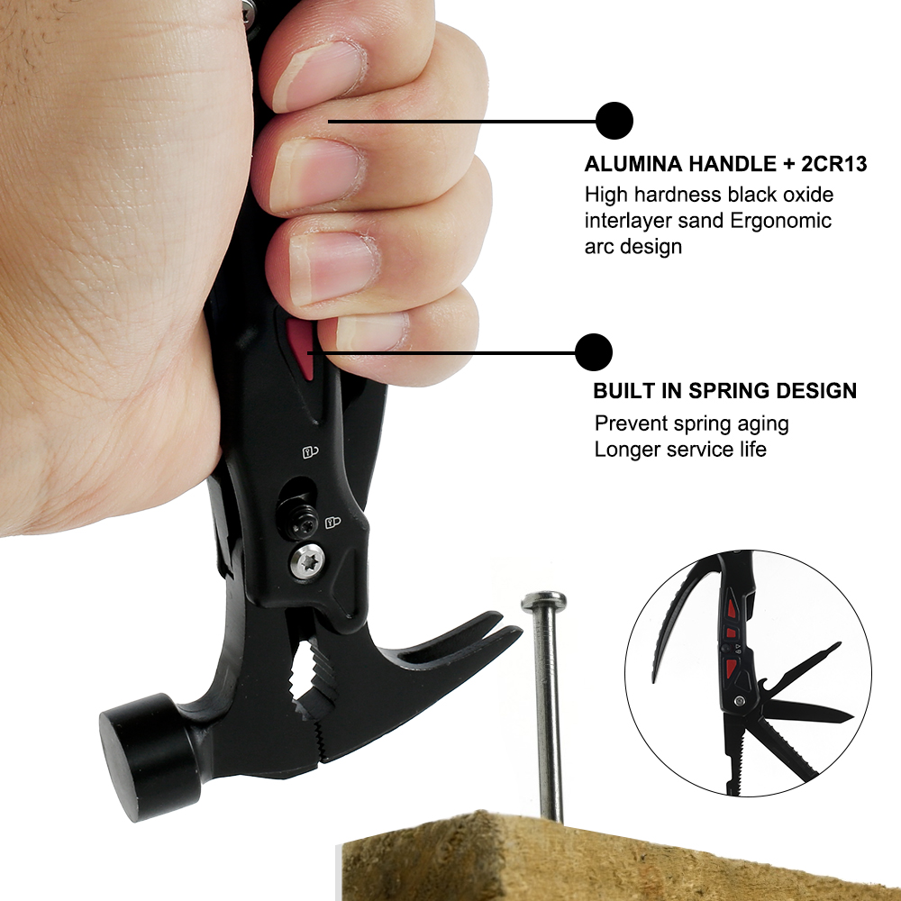 【Все в одном инструменте 】многофункциональный инструмент имеет мини-молоток, подборщик ногтей, плоскогубцы, тиски, резец проволоки, нож, двухрядную пилу, зубчатый нож, пилку, отвертку с плоской головкой, отвертку Phillips, открывалка для бутылок и так далее.