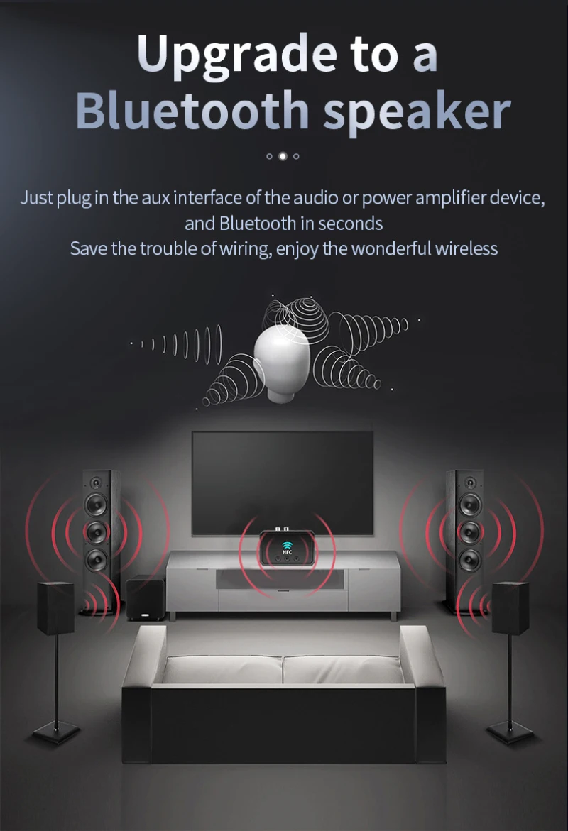 【 Поддержка s NFC 】 встроенный чип, вы можете напрямую подключаться к NFC мобильный телефон или другому устройству bluetooth с поддержкой NFC одним касанием этого приемника