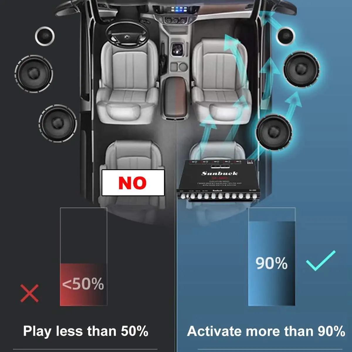 -7 регулируемых полос выравнивания (50 Гц, 125 Гц, 315 Гц, 750 Гц, 2,2 кГц, 6 кГц и 12 кГц), каждая полоса регулируется от-18 дБ до + 18 дБ. Регулируемая частота сабвуфера от 43 Гц до 120 Гц