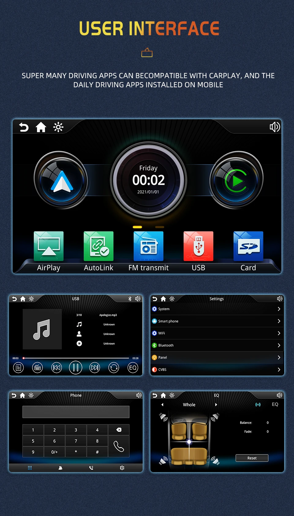Звук работает синхронизацией того же fm-радио канала, что и автомобильное fm-радио или AUX кабельным подключением