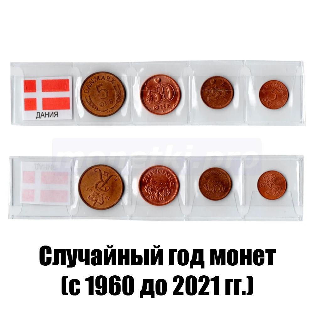 Вы получите комплект из 4-х монет Дании номиналом 5, 25, 50 эре случайного года выпуска.