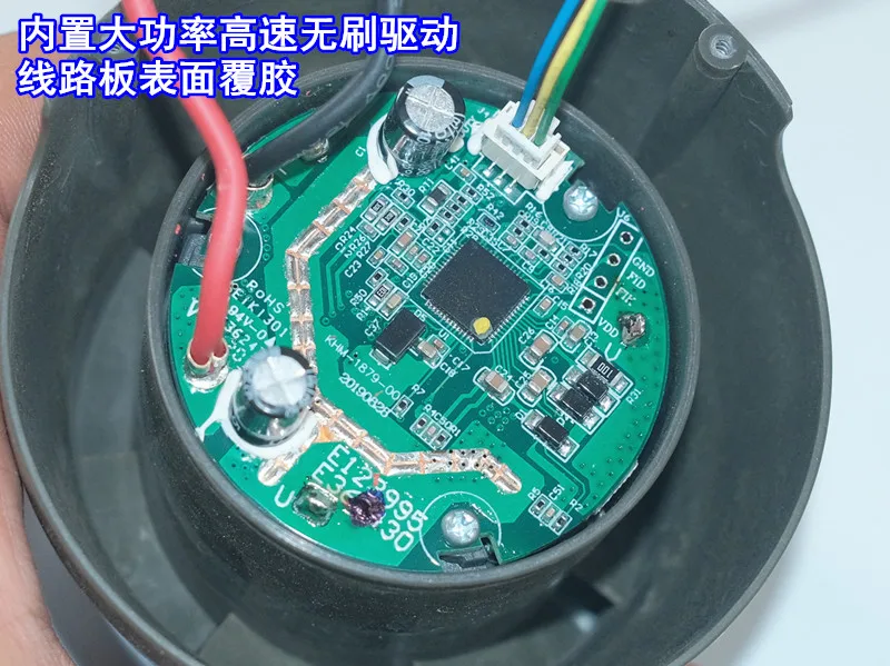 Used disassembled machine with shell super high-speed three-phase brushless vacuum cleaner motor. This motor was originally used on high-end rechargeable vacuum cleaners. The motor has a built-in high-power brushless drive, and the maximum no-load current at full power is about 7.5A. The speed is very high. The high speed of the tidal high-speed motor has extremely high requirements on the balance of the motor, so the rotor and impeller of the motor have been dynamically balanced, and the bearings are all imported ball bearings. In addition, the air duct of this fan is slightly different from that of common dust suction fans. This fan is an independent air duct, and the air intake will not pass through the inside of the motor. There is a fixed spiral decompression air duct on the outside and a circuit board at the tail. There is a cover and a rubber ring inside is sealed.