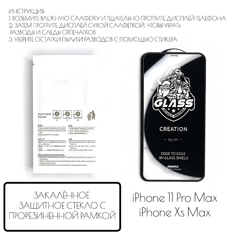 Комплектация: защитное стекло, спиртовая салфетка, микрофибра, наклейка для удаления пыли, два стикера, упаковка