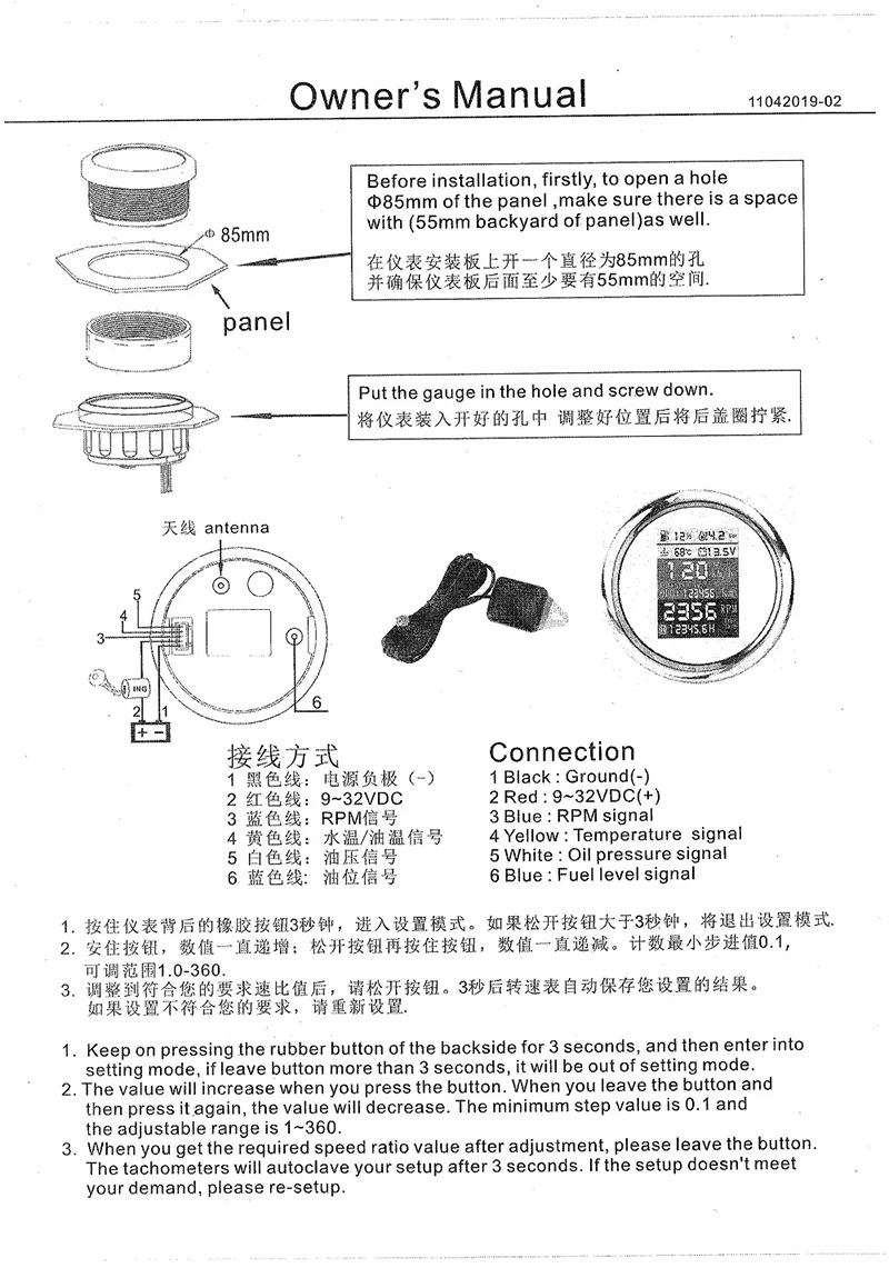 -Значение увеличится при нажатии кнопки. Когда вы оставляете кнопку и снова ее нажимаете, значение уменьшается. Минимальное значение шага составляет 0,1, а регулируемый диапазон составляет 1,0-360,0. (Настройка тахометра)-Когда после настройки вы получите требуемое значение коэффициента скорости, пожалуйста, оставьте кнопку. Тахометры автоклавируют вашу настройку через 3 секунды. Если установка не соответствует вашим требованиям, переустановите.-ОбязательноСначала нажмите кнопкуИ включите питание, можете выбрать английский или китайский.Размеры:-Диаметр 85 мм (3-3/8 дюйма)