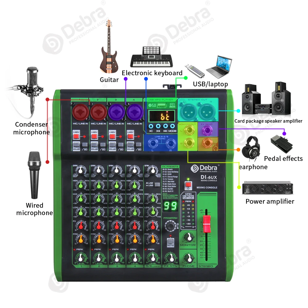 1. Профессиональные эффекты FX могут быть выбраны через ручку, предоставляя вам 99 видов профессиональных эффектов, так что вы можете получить сценический звук.