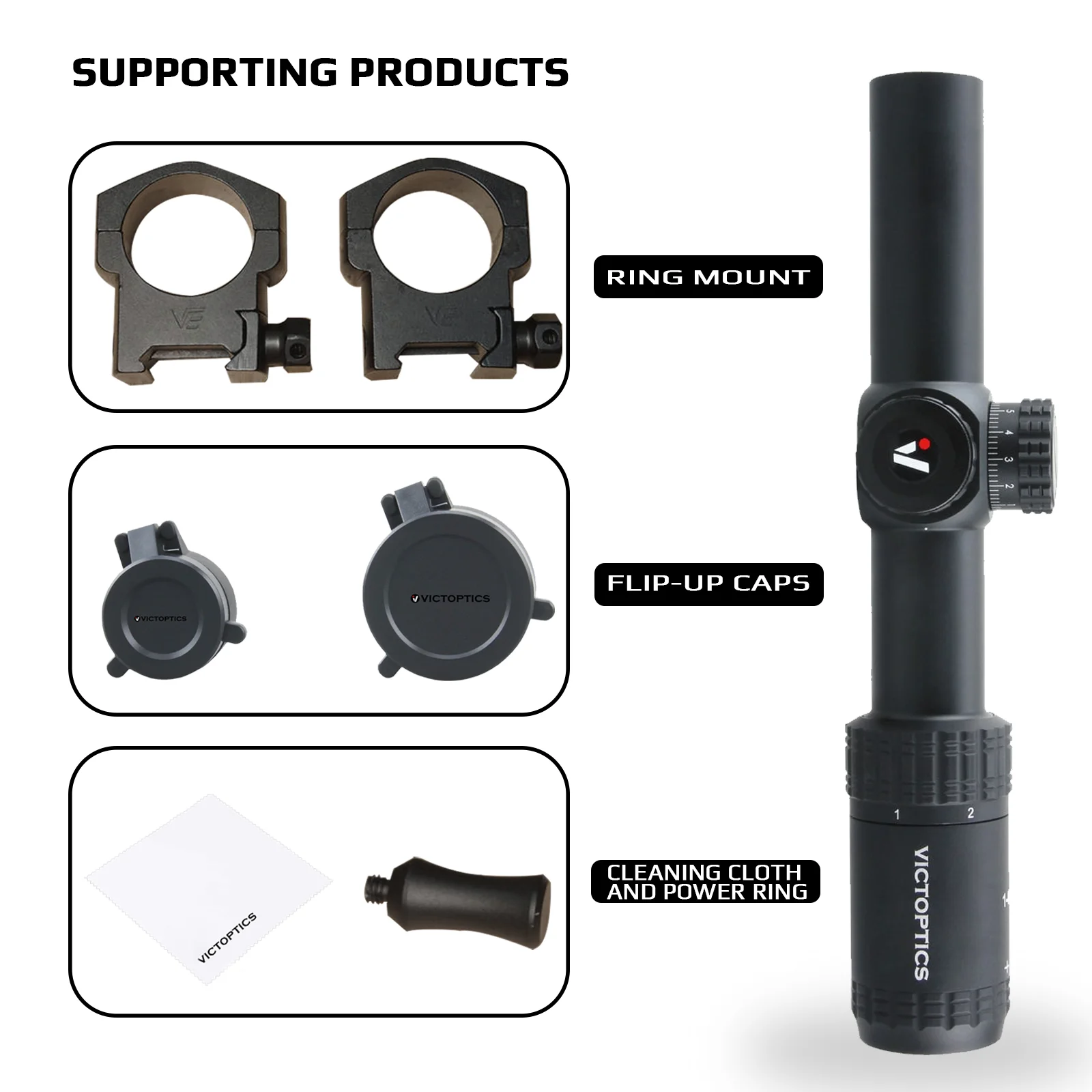 · Включая элементы: 30 мм Пикатинни низкое кольцо (по умолчанию) или ткач или ласточкин хвост крепление, откидные колпачки и Чистящая ткань и т. Д.