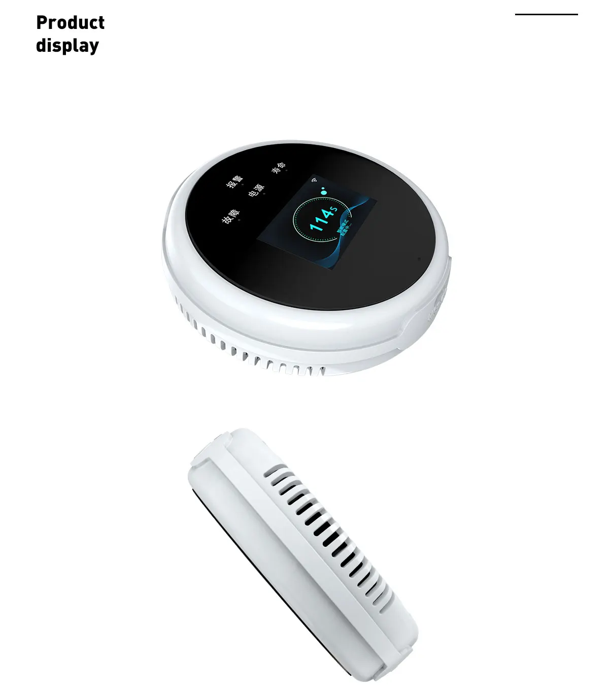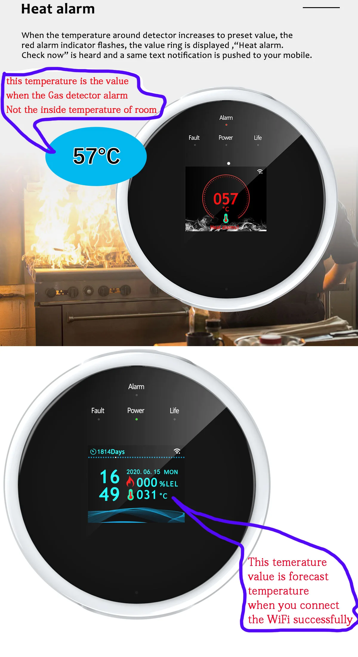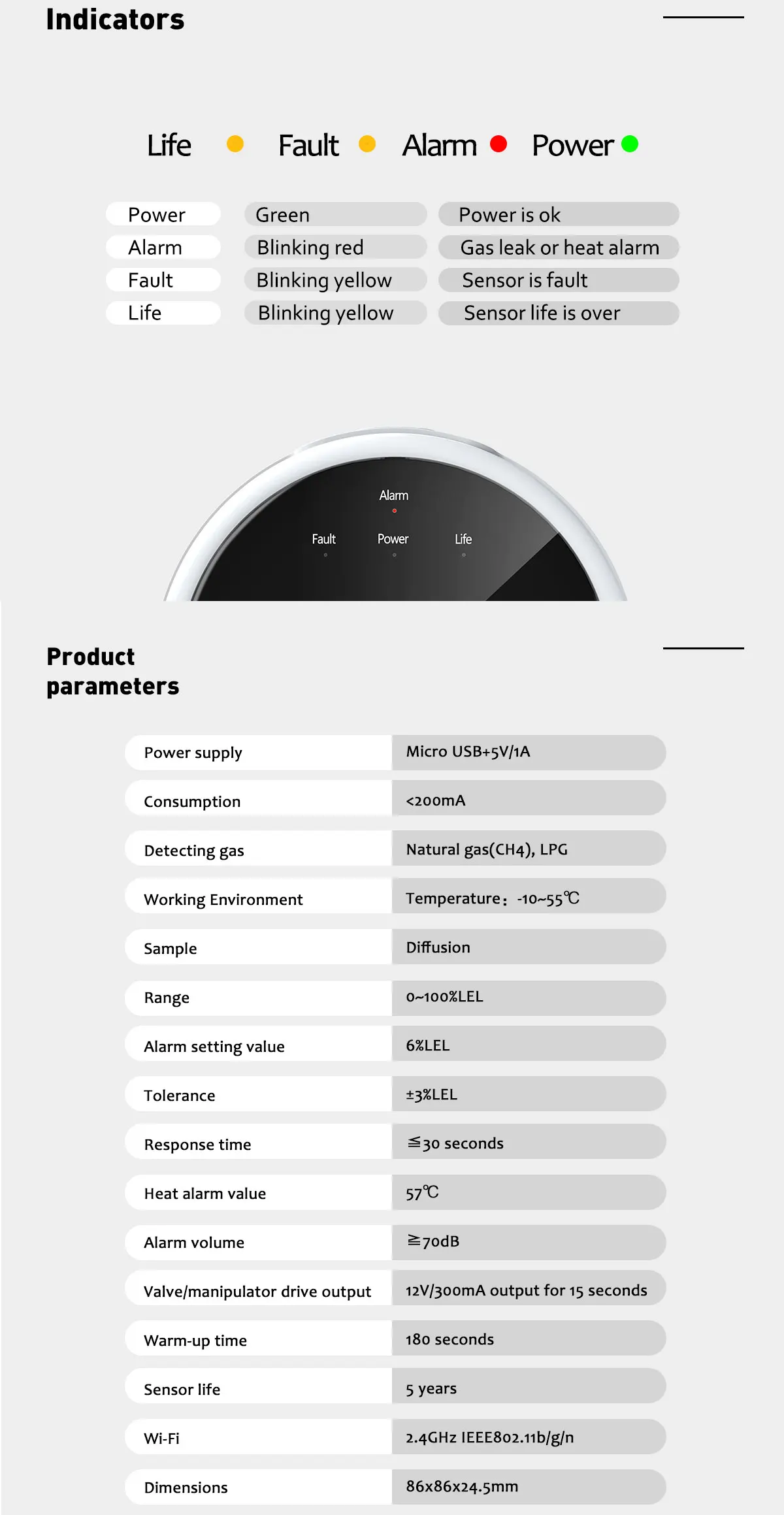 This product is designed to detect explosive gases(natural gas and LPG) in the air for houses, offices and similar places etc. In case of gas leak, it alarms sound with voice prompt, push text notification to your mobile and drives the valve/manipulator to turn gas leak source off. It is also a fire alarm device with the built-in heat sensor designed to respond when the convected thermal energy of a fire increases the temperature. You can get the gas level and temperature via a mobile application from any point of the world, and an Internet connection via a Wi-Fi 802.11 b/g/n(2.4GHz) network is required for operation.TFT color LCD screen displays with date and time, gas level, temperature and life days remained