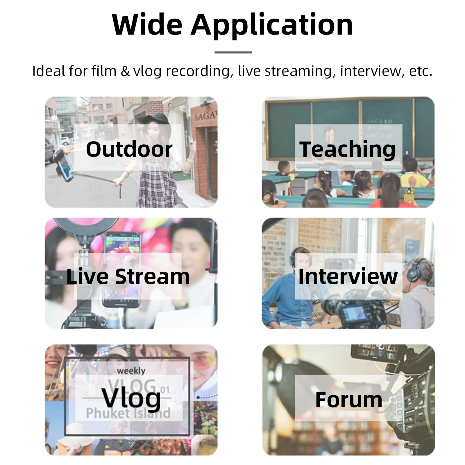 Принимает 2,4 ГГц Частотный диапазон с стабильную передачу сигнала и 20 м эффективный диапазон, идеально подходит для фото и vlog запись, прямые трансляции, интервью и т. д.