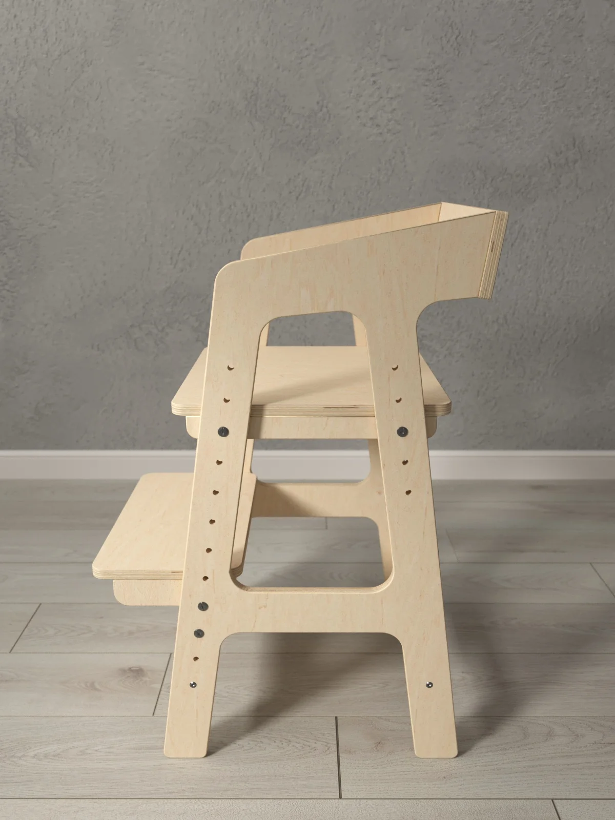 Стул изготовлен из высококачественной березовой фанеры и тщательно отшлифован. Сиденье и спинка окрашены сертифицированной белой краской. Все грани регулируемого детского стула имеют округлое и гладкие формы дизайна позволяют не беспокоиться о безопасности ребенка при обращении со стулом.