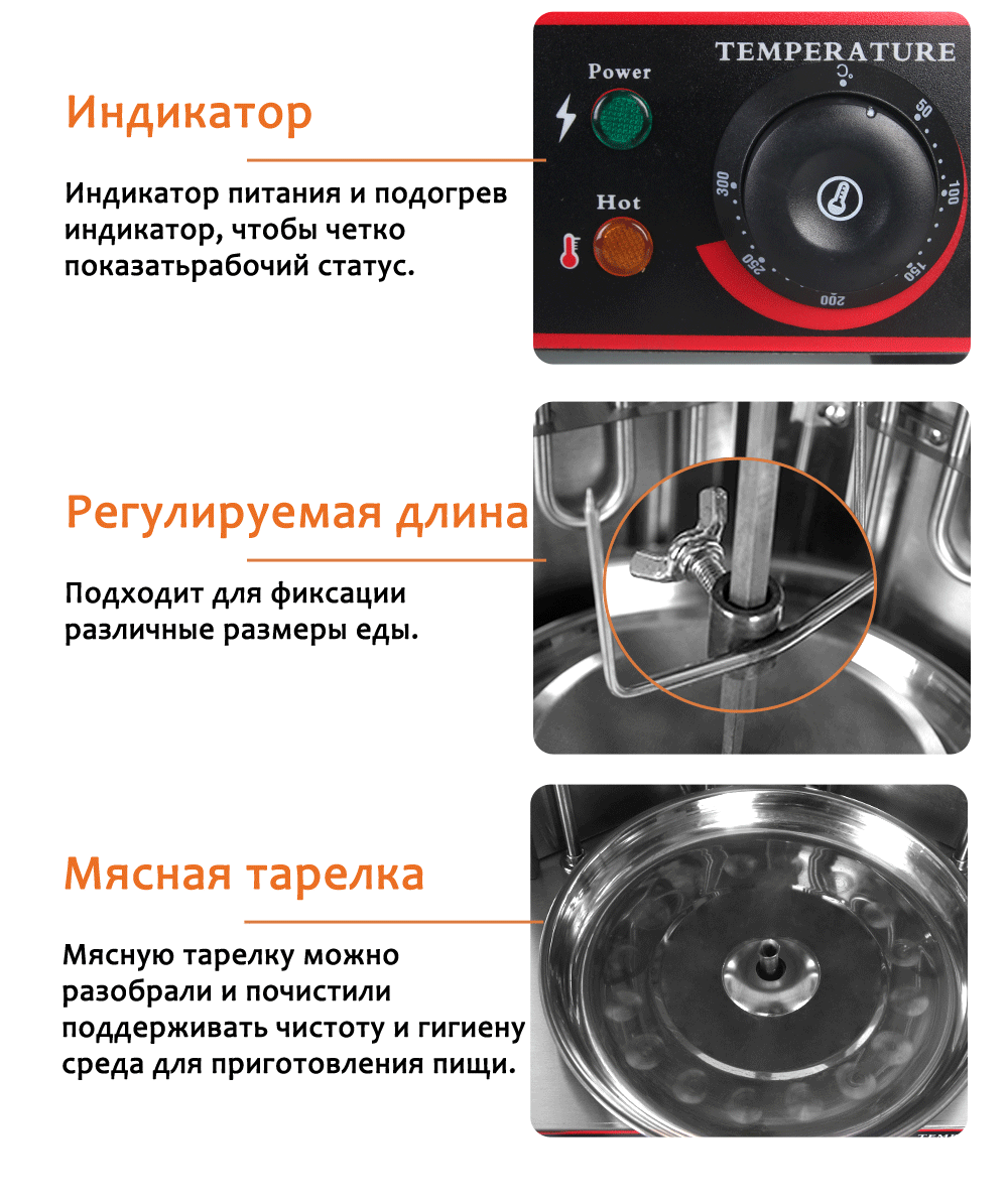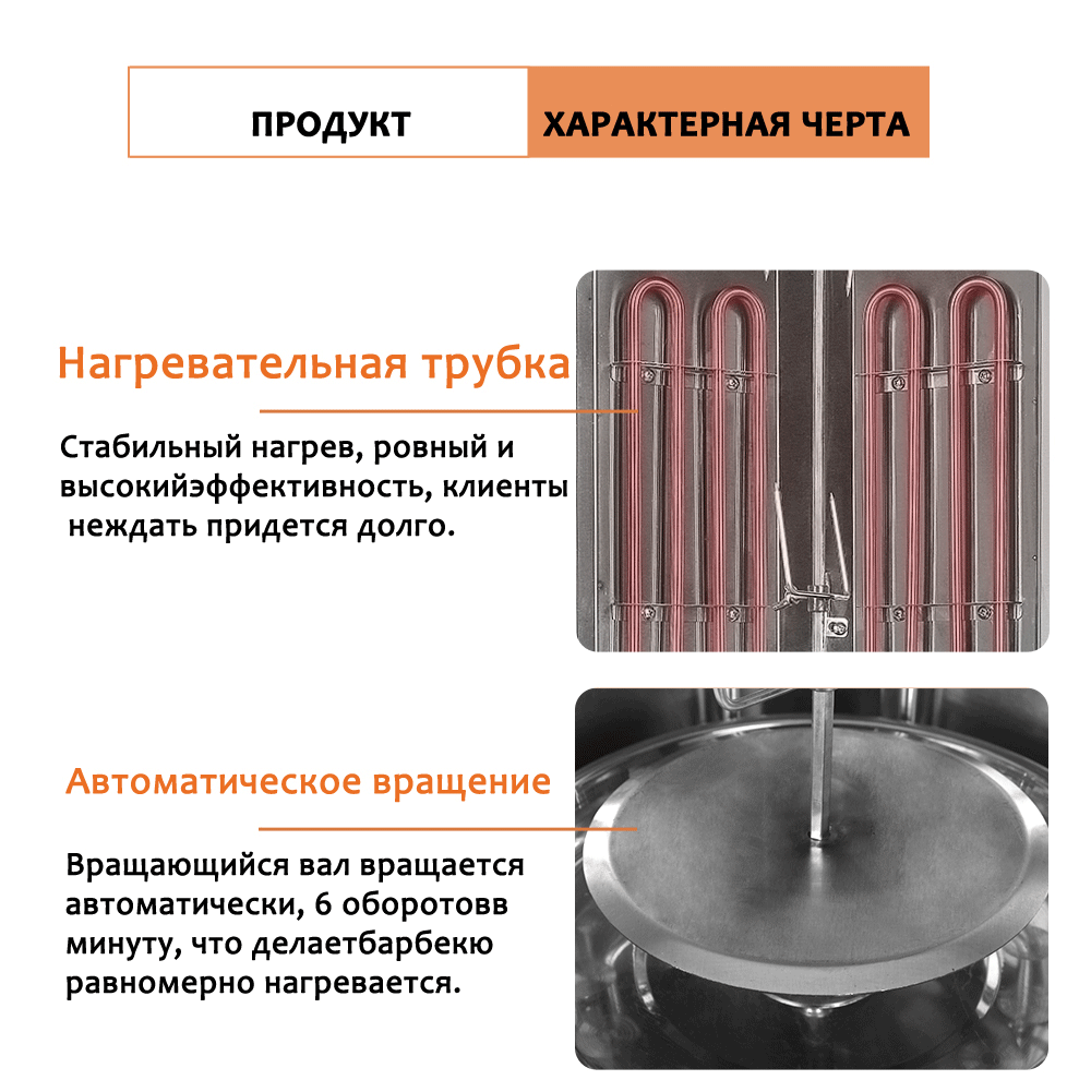 2. Вращающийся вал вращается автоматически, 6 оборотов в минуту, что делает барбекю равномерно нагреваться.