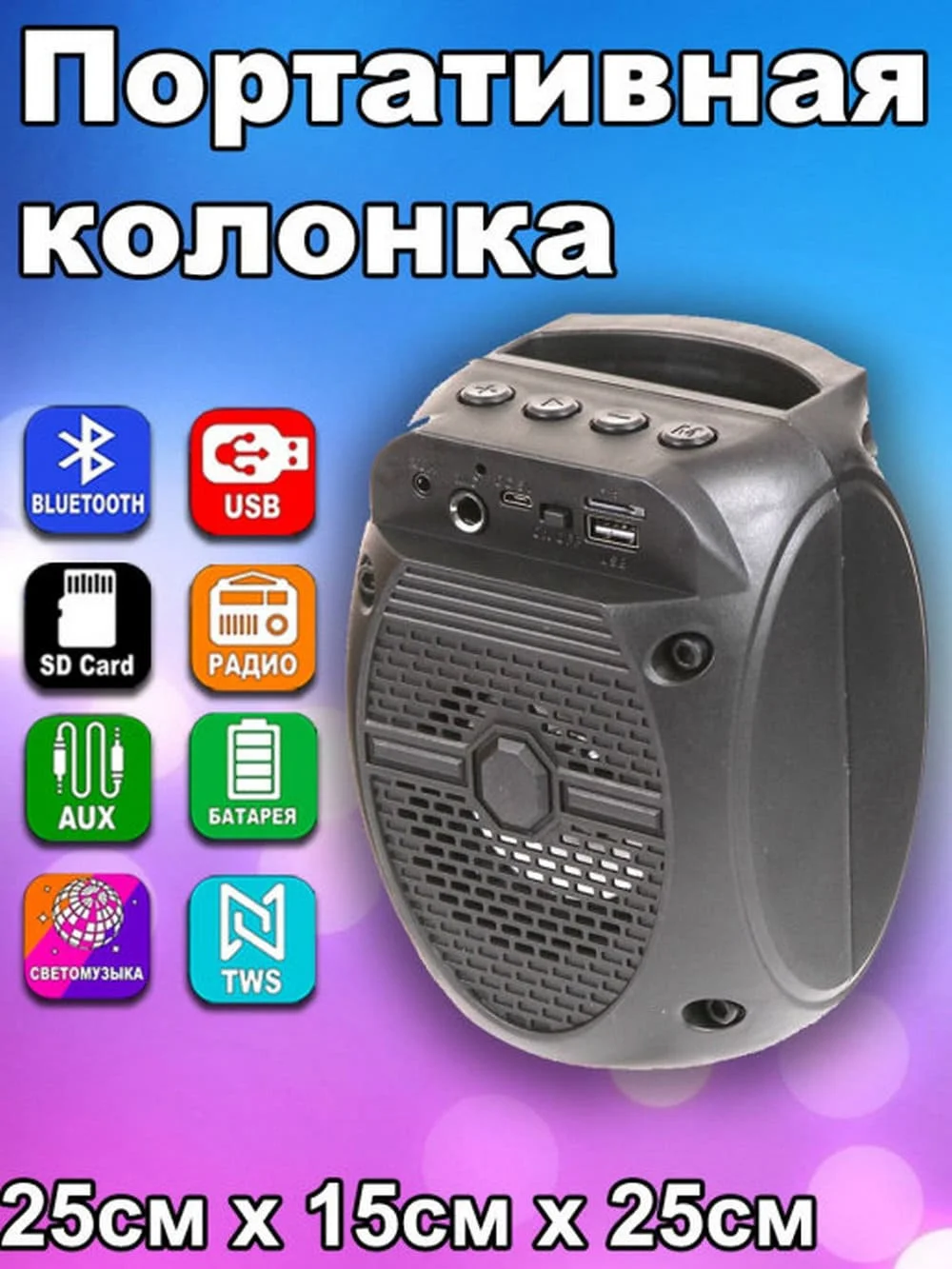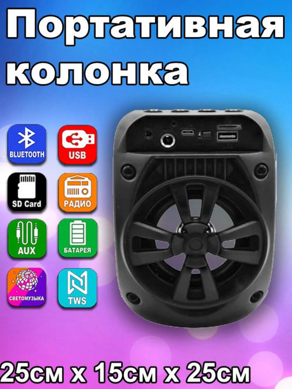 Портативная блютуз (bluetooth) колонка переносная на аккумуляторе со светодиодной подсветкой. Колонка обладает громким и мощным звуком. Современный стильный дизайн колонки , а также удобная ручка для переноски всё это создаёт удовольствие от использования гаджета. Мощный аккумулятор до 3-5 часов автономной работы. На верхней панели размещены разъемы под карту памяти и зарядного кабеля, который идет в комплекте Это действительно красивый вариант среднего размера с качественным звуком. . Одним словом качественная красивая колонка . Которая подойдет как для себя, так и для оригинального подарка.