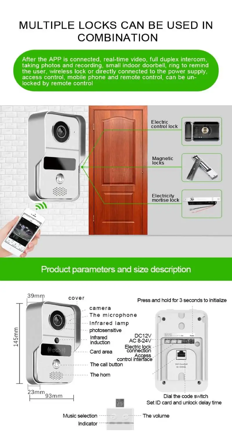 Описание товараУмный дверной звонок соединяет WiFi или сетевой кабель. После того, как Посетитель нажимает кнопку вызова, смартфон взаимодействует с дверным звонком через видео в реальном времени, полнодуплексный разговор, фотографирует, снимает видео, дверной звонок в помещении и напоминает пользователю.