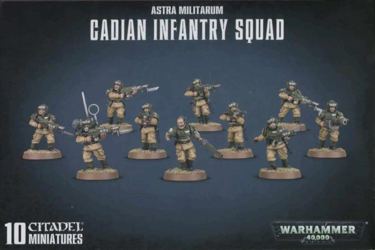 В этом пластиковом наборе вы найдете все необходимое, чтобы собрать 10 миниатюр Кадианских Ударных Пехотинцев (Cadian Shock Troops). Набор содержит пять видов ног, семь вариантов голов, два цепных меча, два лазерных пистолета, две ракетницы, два огнемета и два вокс-передатчика. Также в комплект входят дополнительные детали, позволяющие собрать одного Сержанта и индивидуализировать весь отряд. К моделям прилагаются 25 мм. круглые подставки.