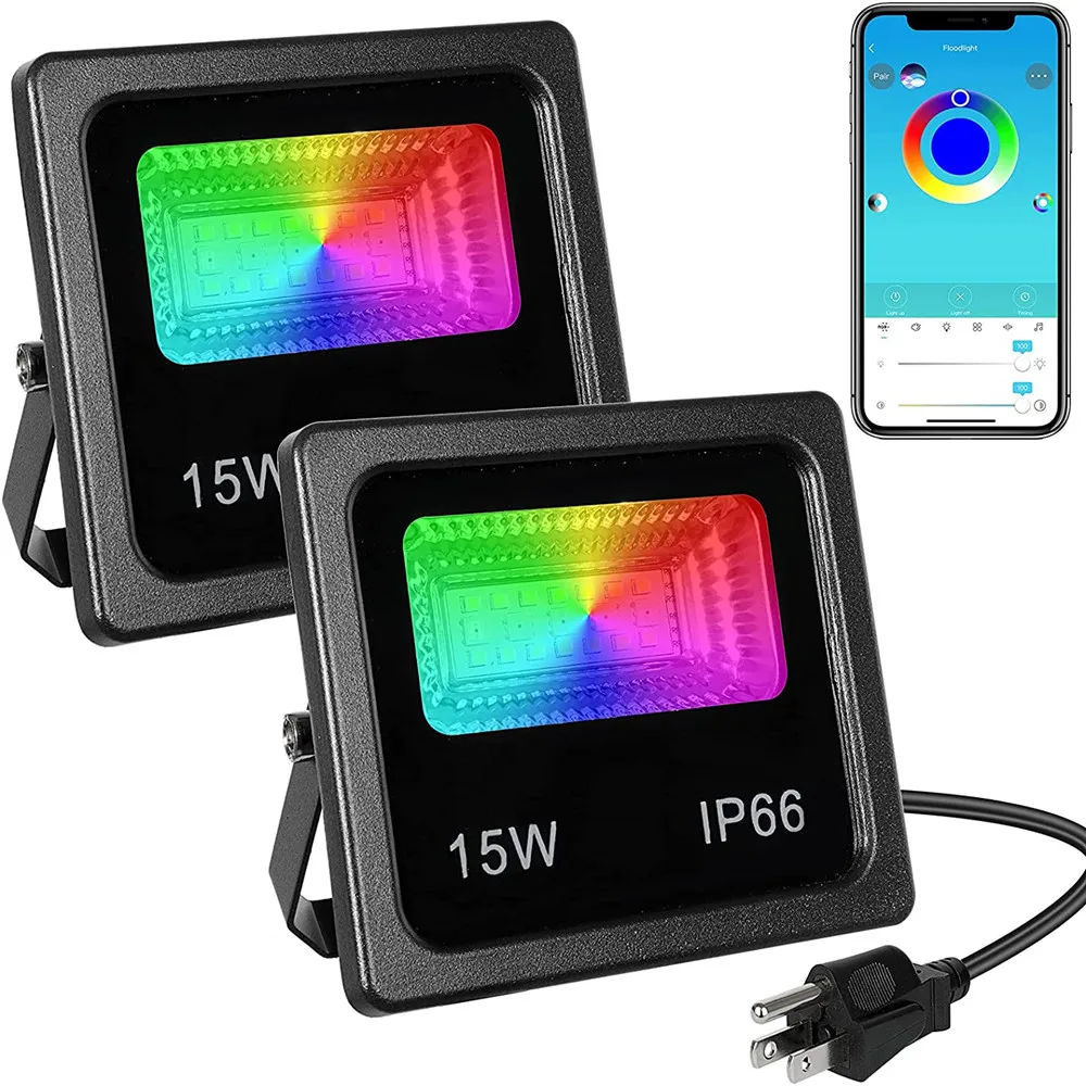 2 шт. светодиодный прожектор, 15 Вт умное управление через Bluetooth RGB + белый прожектор, синхронизация музыки, 16 миллионов цветов, 20 режимов освещения, IP66 водонепроницаемое наружное сценическое ландшафтное освещение, подходит для веранды/улицы/двора/балкона/павильона/