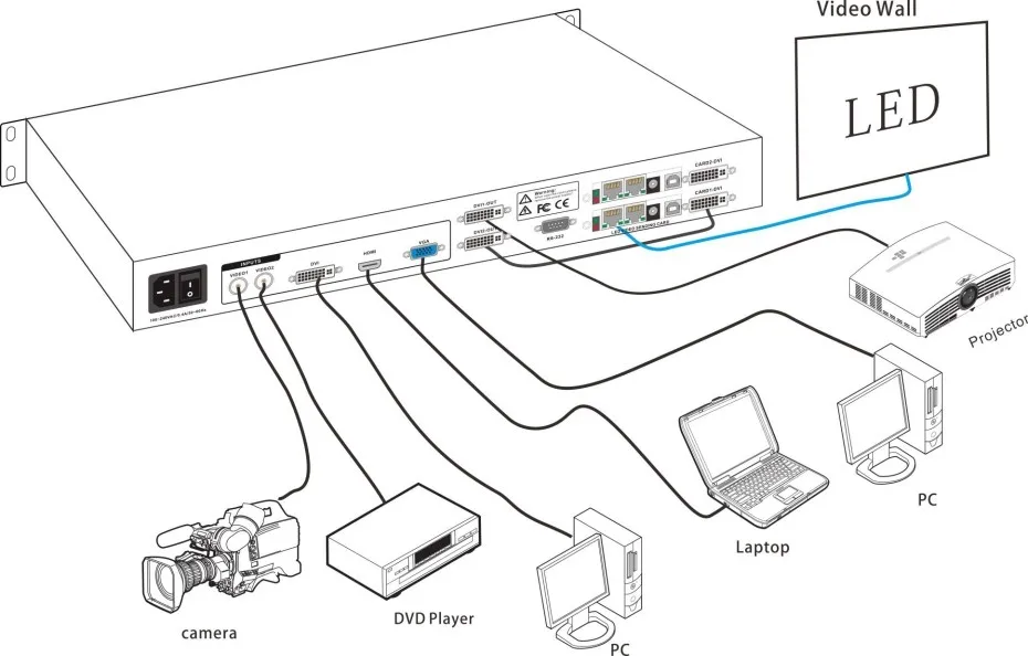 2 CVBS, 1 VGA, 1DVI, 1 HDMI, в основном охватывает гражданских и промышленных целей. Переключение всех видео входов позволяет быстро резать и выцветать переходы.