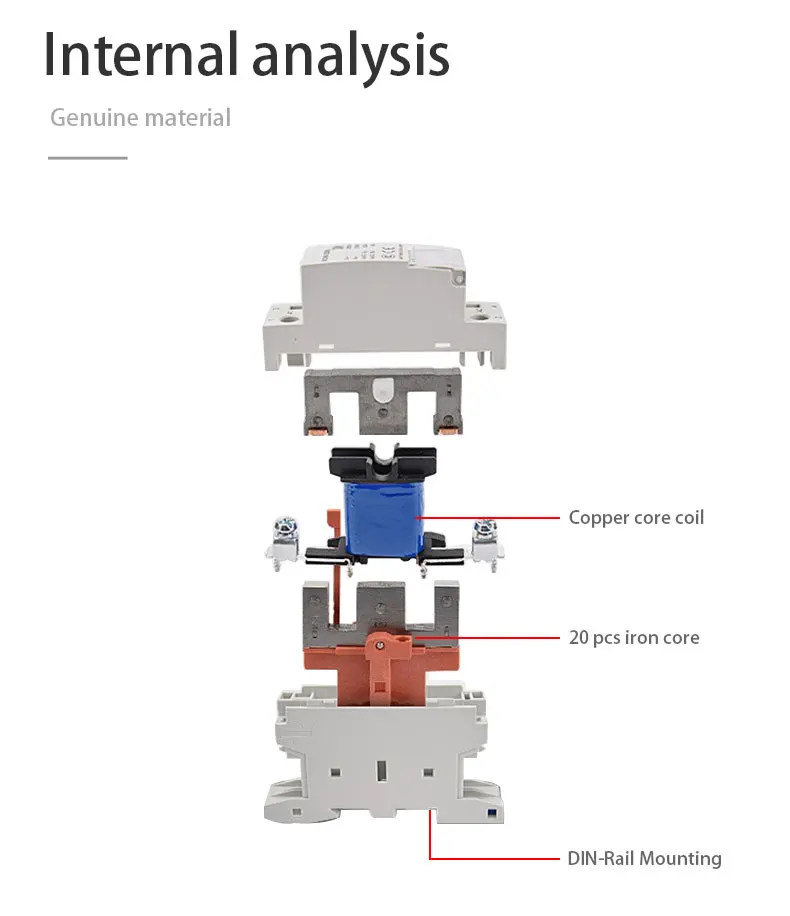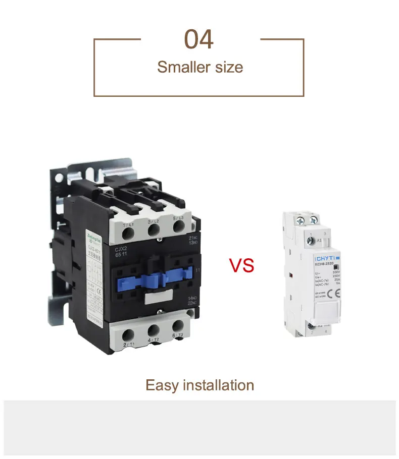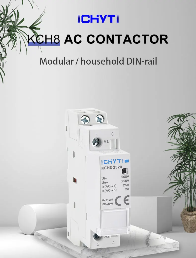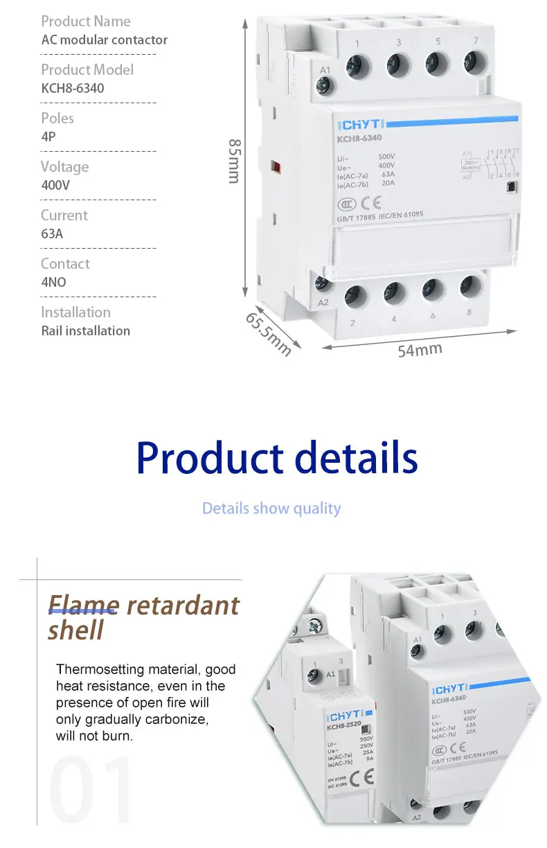 KCH8 серия AC контактор для дома в Основном предназначен для цепей переменного тока 50 Гц или 60 Гц с 230/400 В. Номинальное рабочее напряжение при AC-7a использовании, Номинальное рабочее напряжение до 230 В, номинальный рабочий ток до 63А, Номинальное рабочее напряжение в использовании AC-7b, номинальный ток до 20А. Использование в разрыве мощности ниже 6kA цепи. Для расстояния подключения или прерывания цепи.