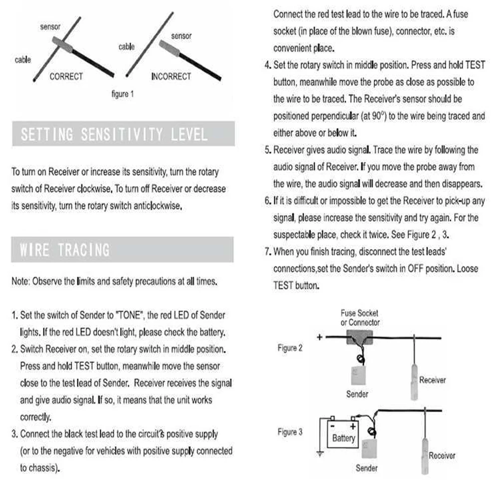 Простота в использовании: Просто подключите передатчик в серии с цепи или провода под тестом, (i. Е.: в месте выдувного предохранителя, через соединитель, в серии с открытым проводом и т. Д.), и сканирование цепи/провода с помощью гибкого зонда для отслеживания, чтобы найти место неисправности.