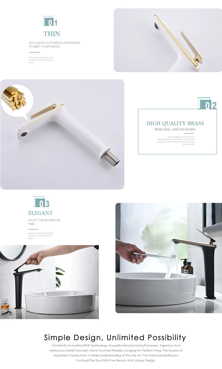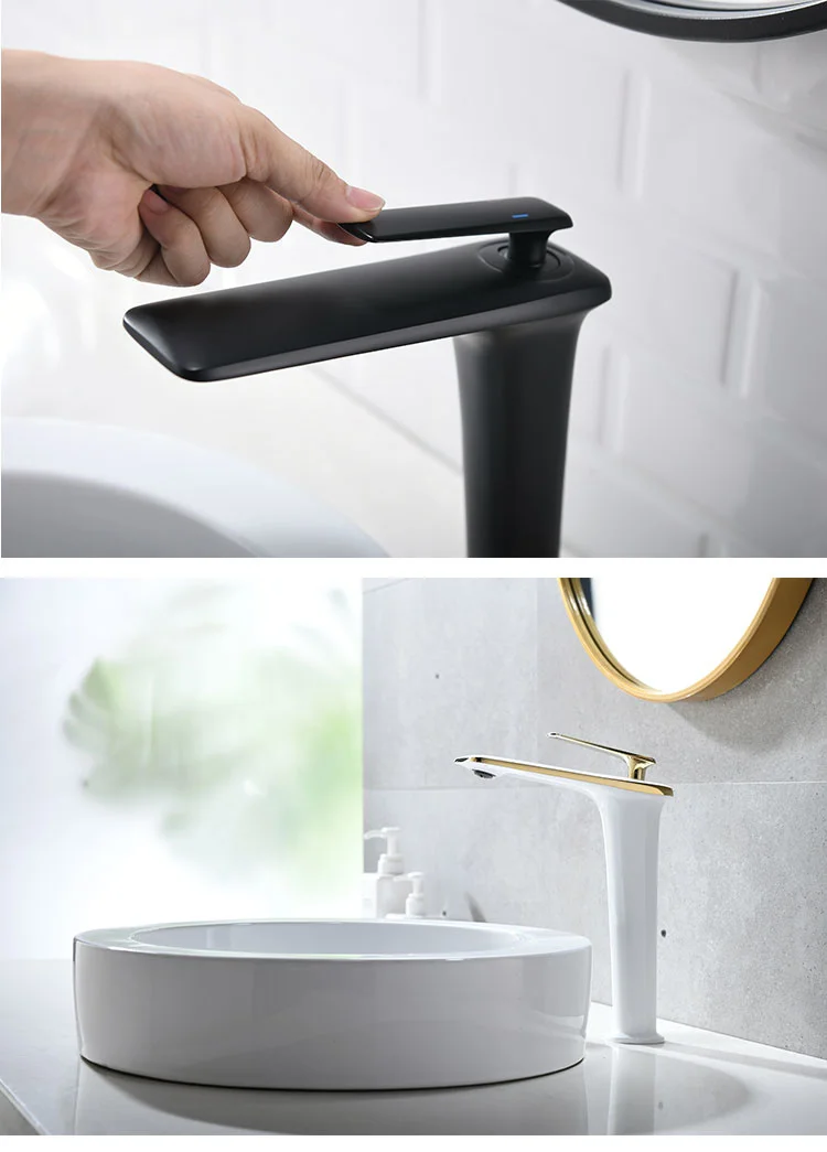 Features and Specifications: Bathroom Basin Faucet Material: Solid Brass Color: Chrome / Matte Black / White Feature: High Body Faucet Installation: Deck Mounted Including All Installation Fittings