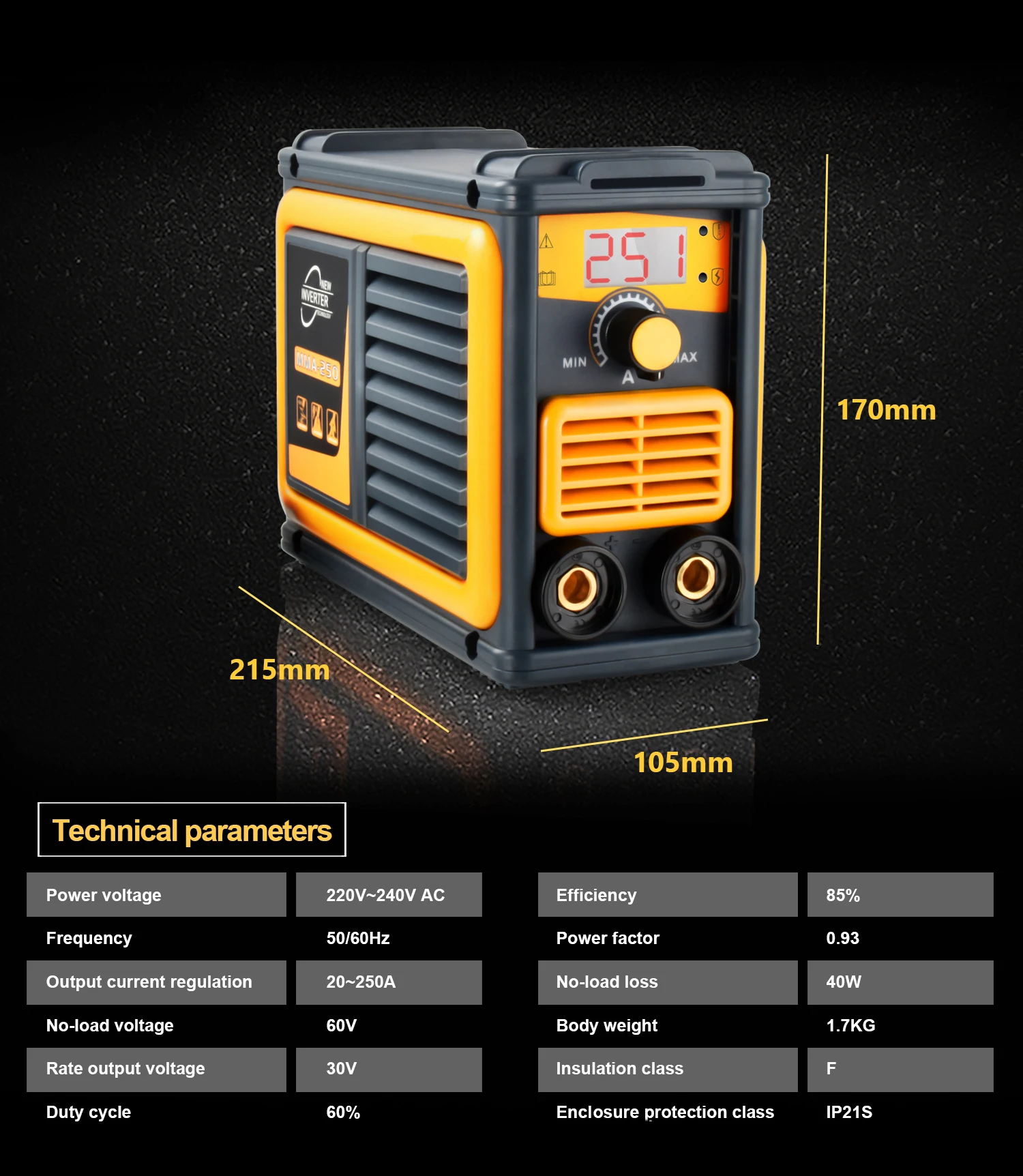 MMA-250 сварочный аппарат подходит для сварки широкого спектра материалов, таких как мягкая сталь, металл, алюминий и другие металлические материалы. Точные параметры можно отрегулировать через ручку, а также есть светодиодный цифровой дисплей.