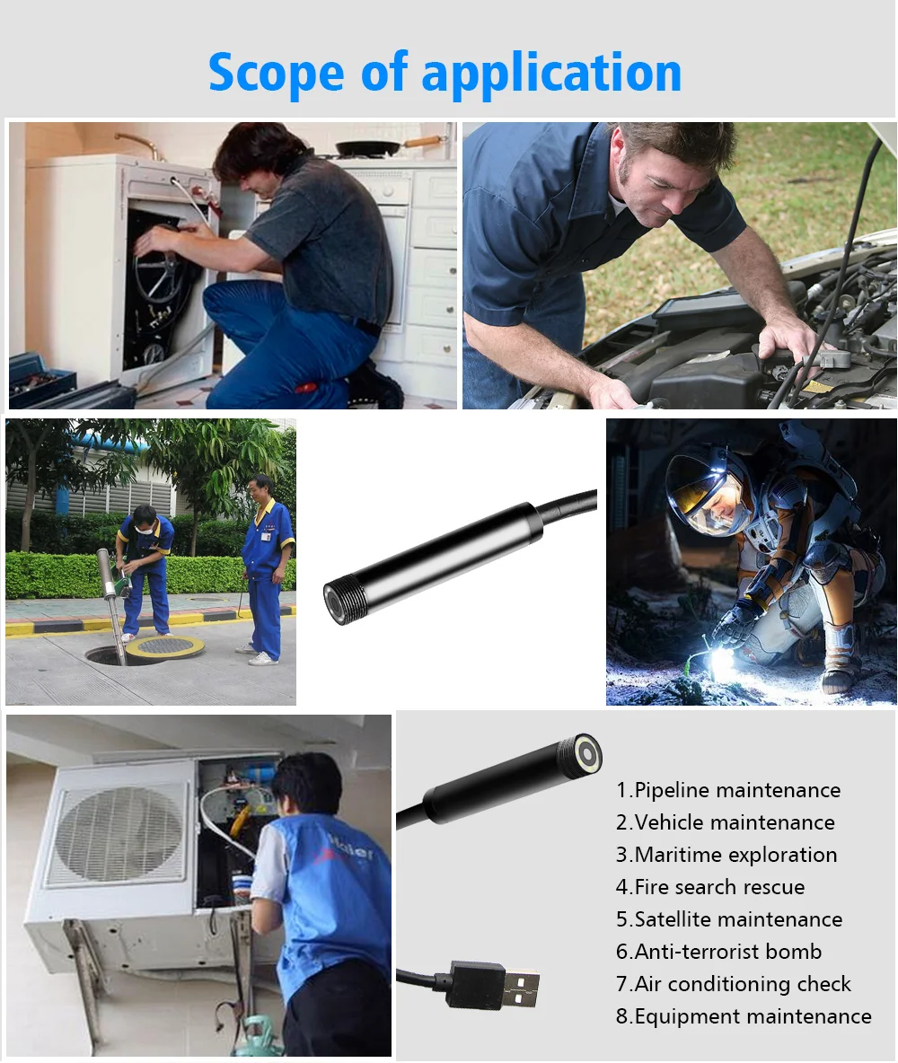 Это используется для подводная камера, водонепроницаемые микро-камеры, детектор автомобиля, детектор канализационных трубопроводов, поиск и спасение, детектор уголовных и таможенных дел, археологическое обнаружение, обнаружение печатных плат, авиационная и космическая промышленность, уход и тракторы, нефтяные буровые отрасли, конструкции и так далее.
