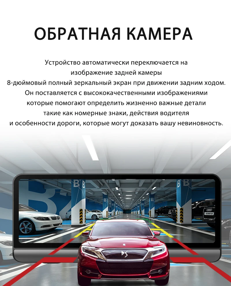 Когда автомобиль находится на заднем ходу, Автомобильный видеорегистратор автоматически переключается на изображение камеры заднего вида с помощью линии парковки.